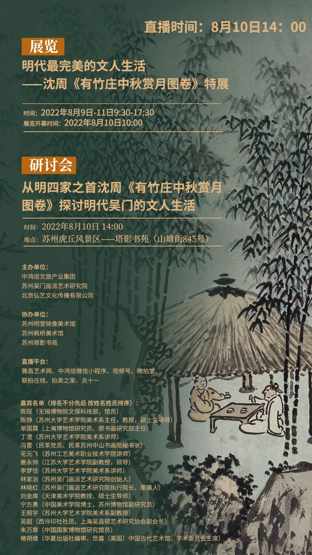 近日,由中鸿信文旅产业集团、苏州吴门画派艺术研究院、北京弘艺文化传播有限公司主办,苏州明堂映像美术馆、苏州枫桥美术馆、苏州塔影书苑协办的大型展览:“明代最完美的文人生活——沈周《有竹庄中秋赏月图卷》”特展即将于8月9日在苏州虎丘风景区——塔影书院(山塘街845号)开幕,展览为期3天。