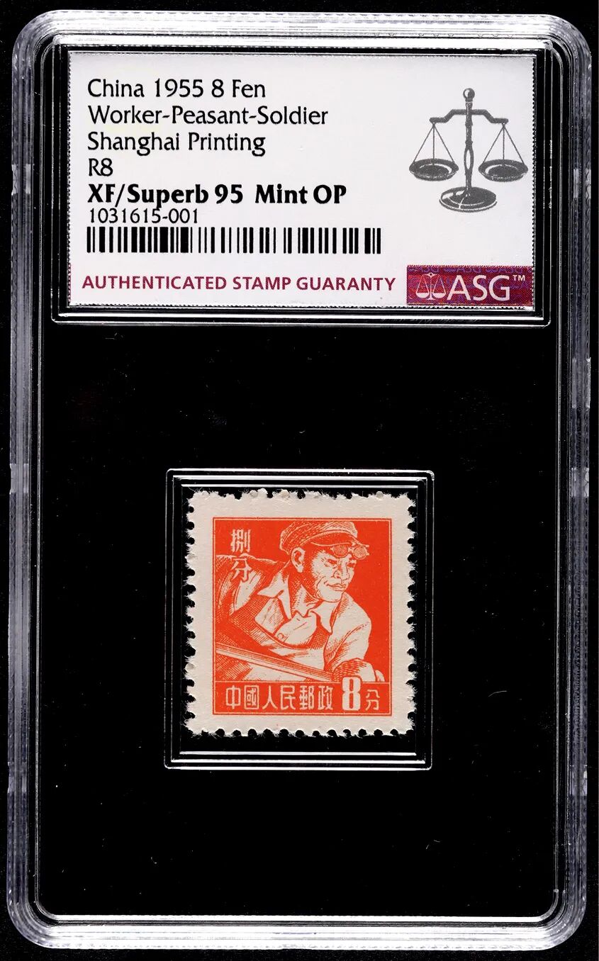 1955年普8甲冶金工人上海版8分新票一枚,ASG 95冠军分且此分数数目前仅此一枚,此票色彩鲜艳,图案居中,非常难得罕见