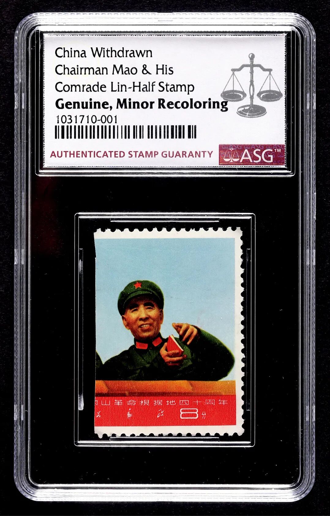1967年《纪念毛主席创建井冈山革命根据地四十周年》“毛主席和林彪像在天安门在城楼上”8分未发行邮票(剪半)一枚,新中国十大珍邮之一,俗称“大蓝天”文革珍邮票品,ASG Genuine。此枚邮票是目前唯一经ASG鉴定并入盒的邮票,极为珍罕。大蓝天邮票一直都给人神秘的感觉,因为目前仅发现完整邮票一枚,剩余所发现者均为右半部份,大蓝天邮票在2011年成交已超过200万,是收藏新中国珍邮不可缺少的一枚重要邮票。未获正式发行原因:当时邮票印刷样张被送至中央有关部门审核时被认为主题与历史事实不符而未获得批准发行,邮票在送审之前亦试印出小部分样票,即要求作统一的销毁,但由于当时正处于特殊动荡时期,销毁处理工作缺乏监管,导致极少量的样票流入民间,非常罕见估价:RMB 1,200,000-1,500,000