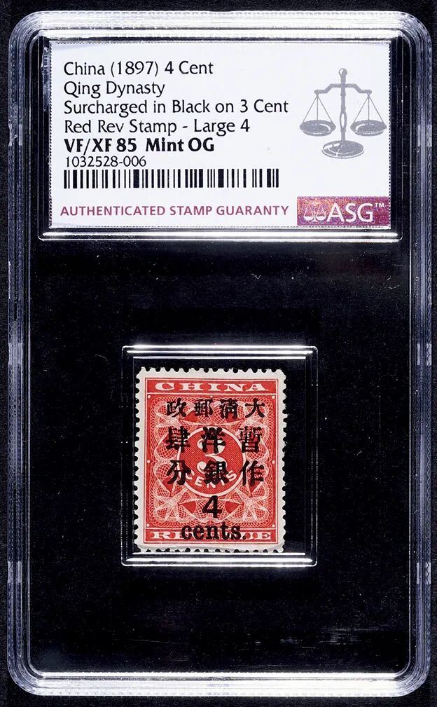 1897年红印花加盖大字4分新票一枚,ASG 85分