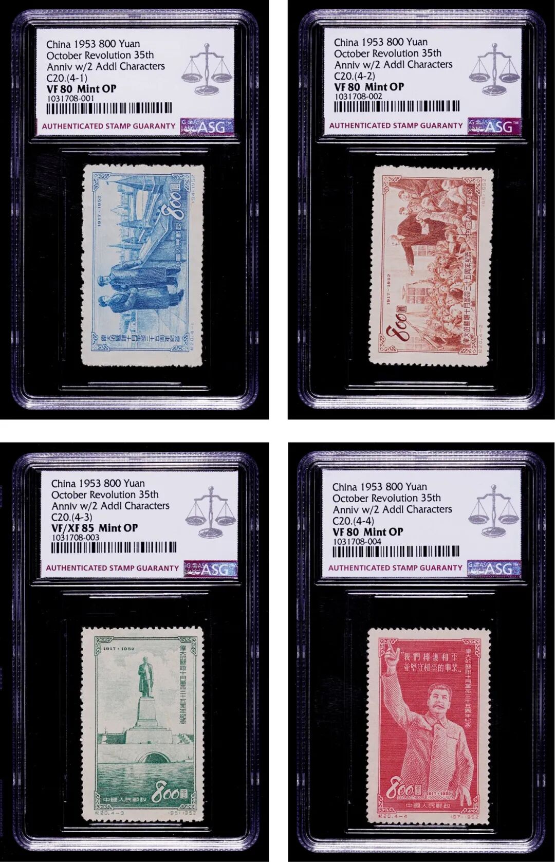 1953年纪20伟大的苏联十月革命三十五周年纪念发行撤销新票全套4枚,ASG 80-85分。此套邮票因邮票标题错误而勒令取消发行,但少部分票品于河南及贵州等少数邮局错误出售,中国邮政于1953年再版发行,但删去“苏联”字样及以不同色泽印刷