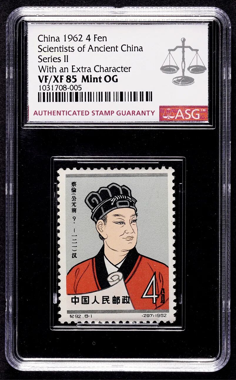 1962年纪92(8-1)蔡伦公元前错体新票一枚,ASG 85分