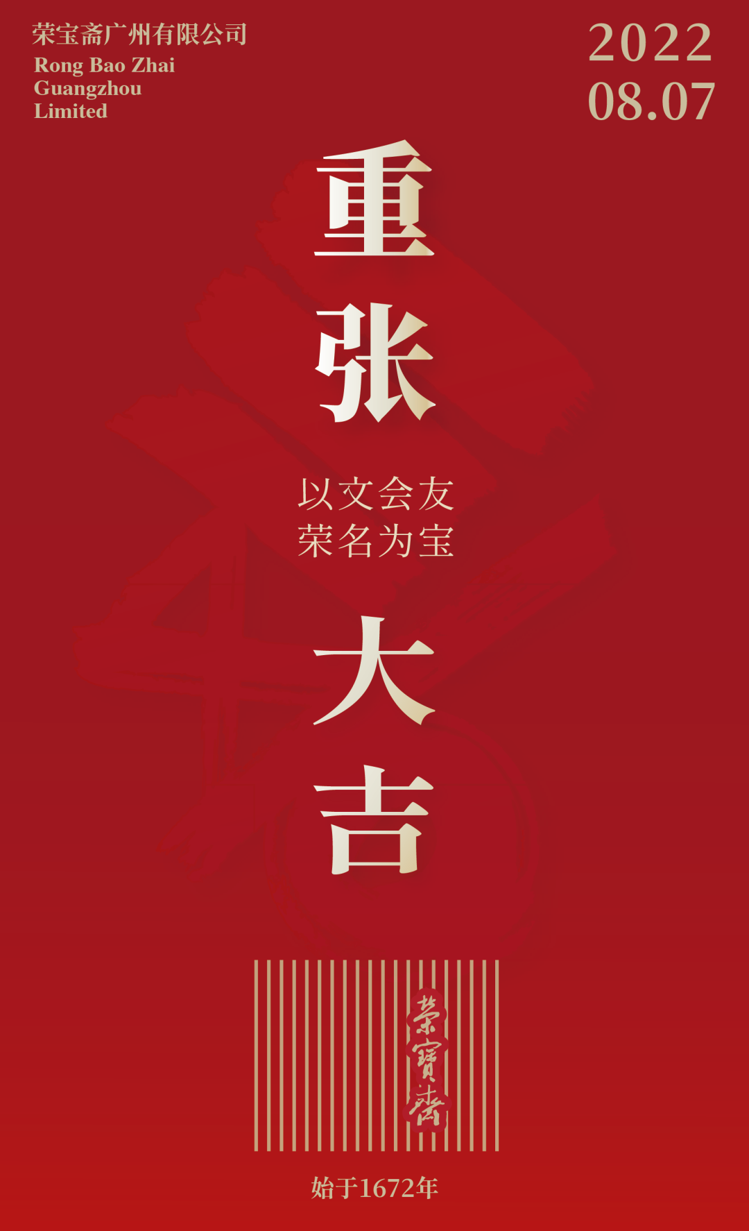 350周年是老字号的新起点,今年也是荣宝斋广州分店重张的元年。荣宝斋广州分店将继承荣宝斋诚信为本,守正创新的核心理念,做好老字号文化品牌传承,担当“弘扬和发展民族文化艺术,服务人民美好生活”的使命,实现“通过传承与创新,构建人民与艺术的桥梁,为社会提供优秀的文化艺术产品,成为繁荣中国文化艺术事业的领导者和最具价值与影响力的文化品牌”的愿景,助力广东省文化强省战略,为社会主义文化强国建设贡献力量,以优异的成绩迎接党的二十大胜利召开!