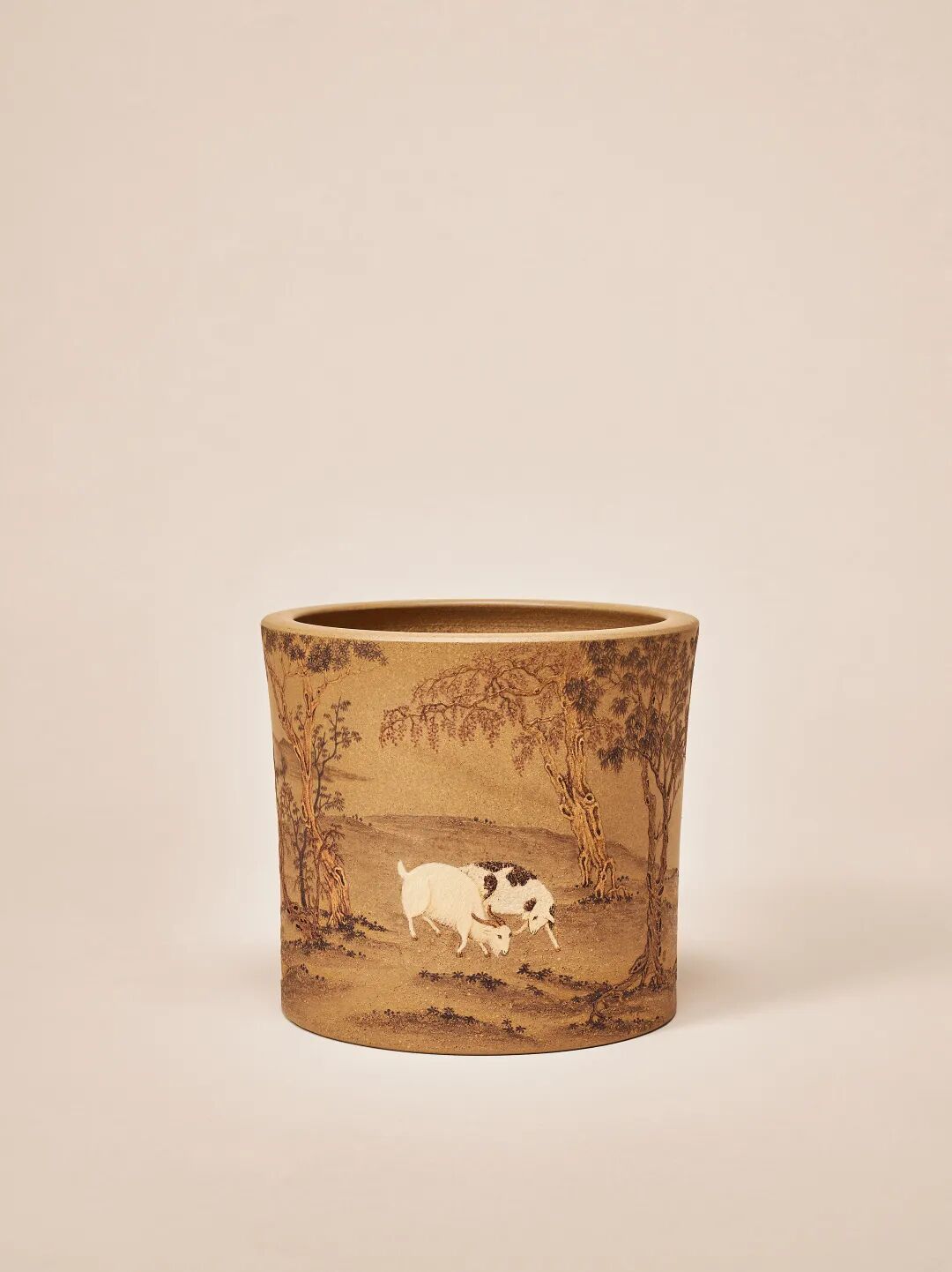 当代 张丹 秋郊牧羊图紫砂五彩堆泥笔筒