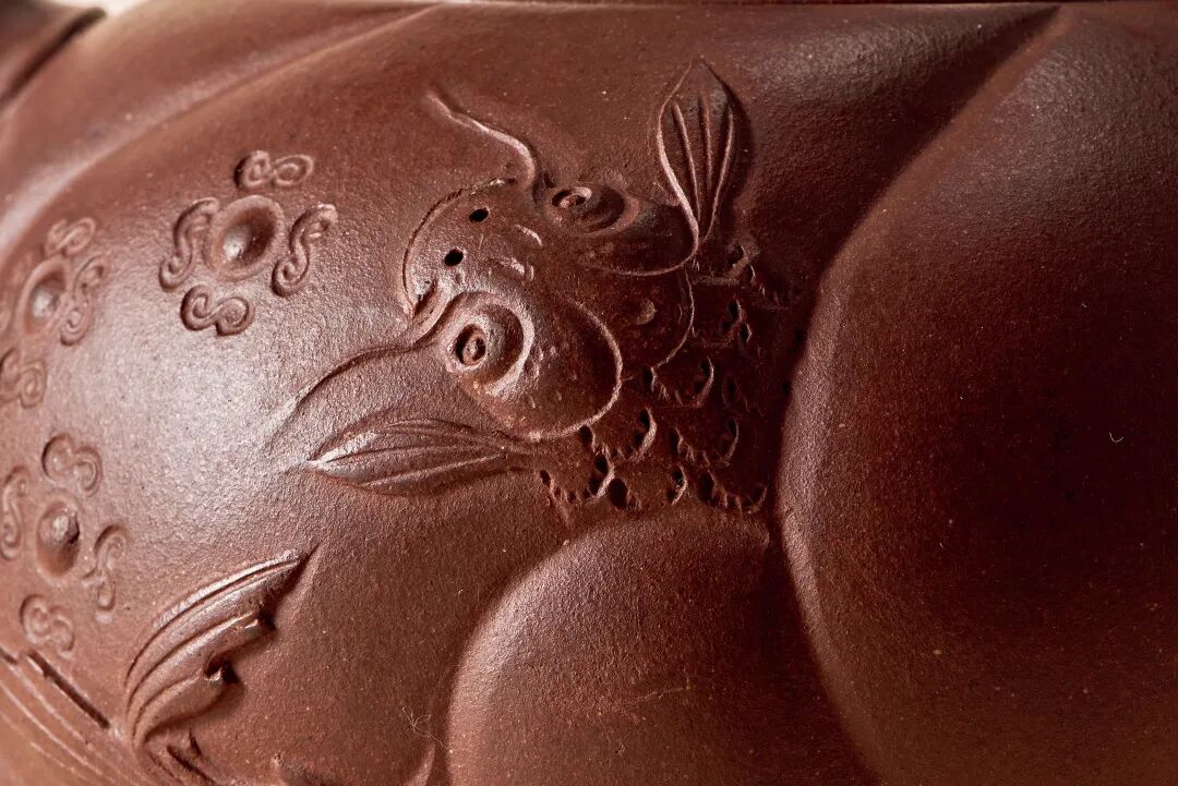 清初直至乾隆,款识空前丰富,寄托款、 堂名款、吉语款、图记款、花押款等等百花齐放。此壶特殊之处在于其盖款钤印,为一树叶,内写“香”字,巧妙融合,颇为特殊。底款“乐山水之主人”,正有文人寄情山水的志趣。