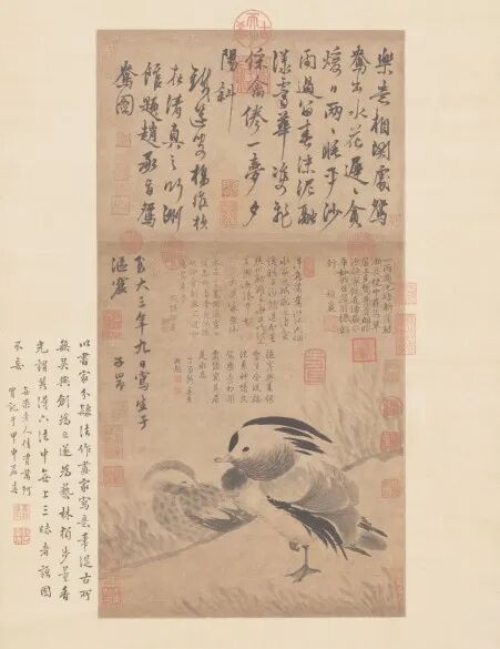 在诗文和书法方面,从本作画面上方之长题足可体现乾隆帝颇为自得之水平。本拍品所对临之作赵孟頫《汀草文鸳图》同为乾隆帝旧藏,是其极为喜爱之作。赵作画面上有乾隆帝丁酉年(1777)御题自作诗,而时隔四年后此诗再次题于本拍品上,并与其另一首自作同韵诗交相呼应于长题之中,可见乾隆帝不仅自矜于其画笔,更兼及自己的诗才和书艺。