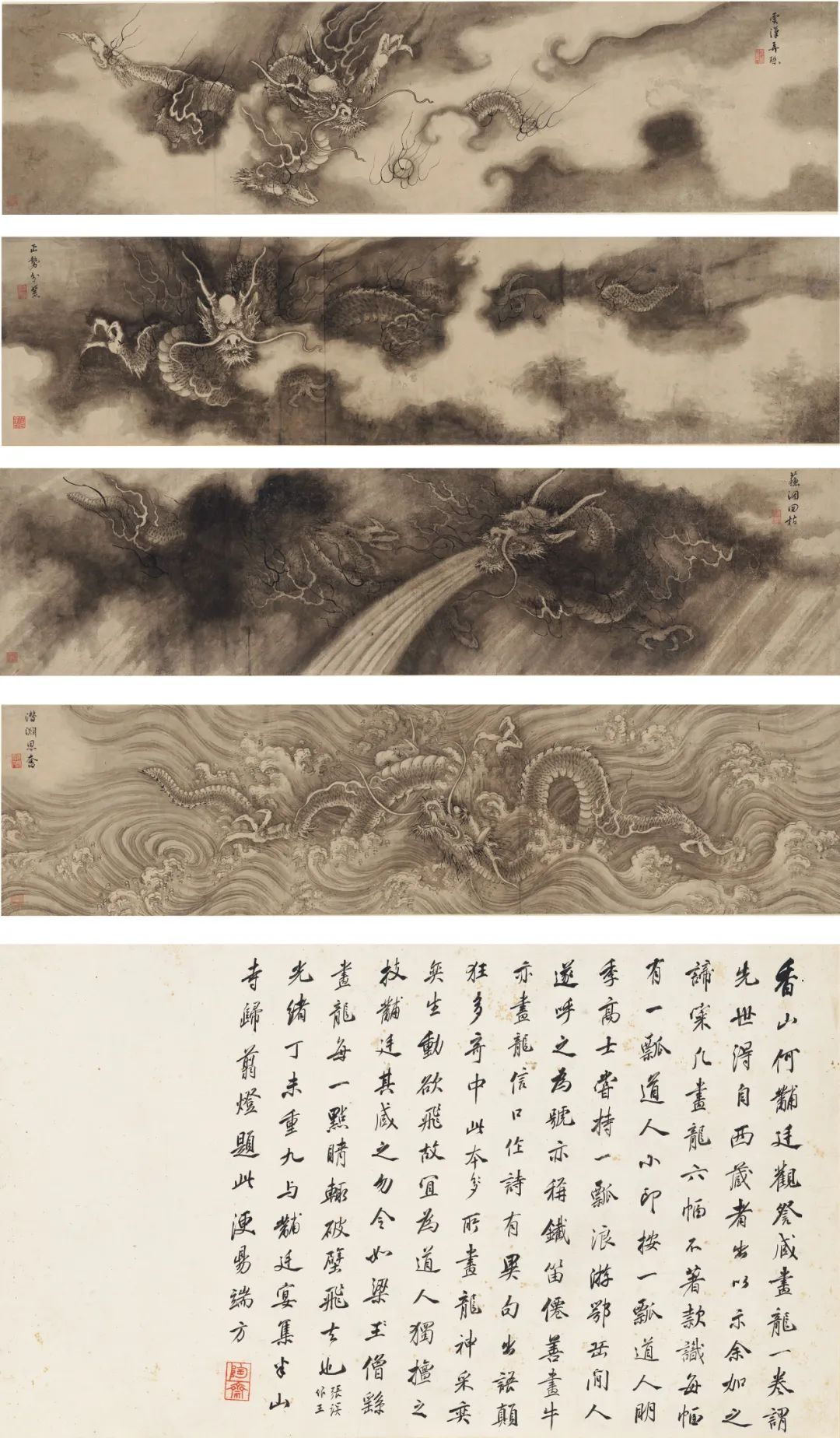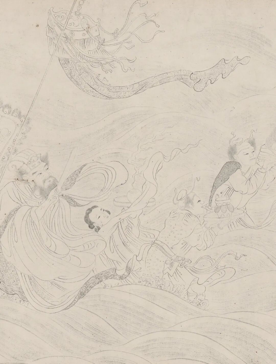 本卷画面所绘为“罗汉渡海”的故事。据佛典记载此故事源自印度,到了明中晚期,画家们“与时俱进”地将八仙与传统“渡水罗汉”结合,罗汉变身八仙而各显神通。画面中蒲团、锡杖、鬼卒、怪兽等等俱成渡具,画中再缀以侍童、降龙、伏虎等情节,众罗汉迎风而立,乘风破浪于滔滔大海中。