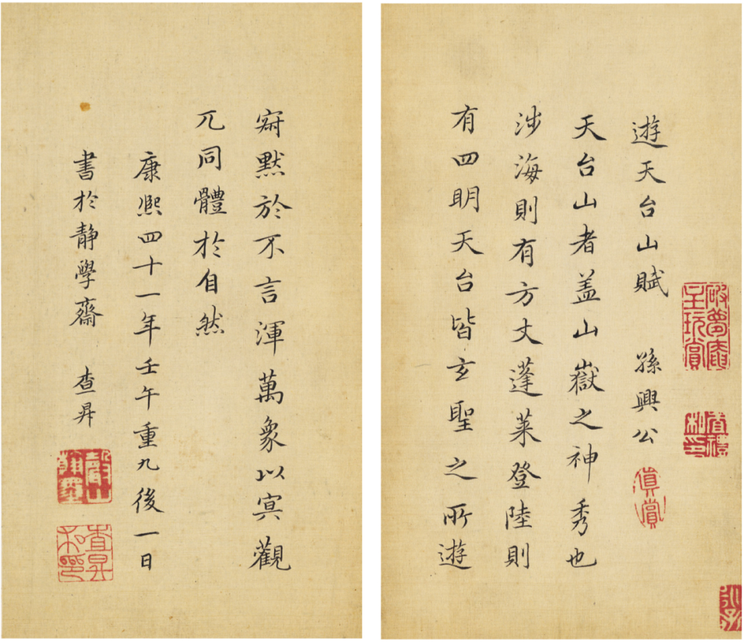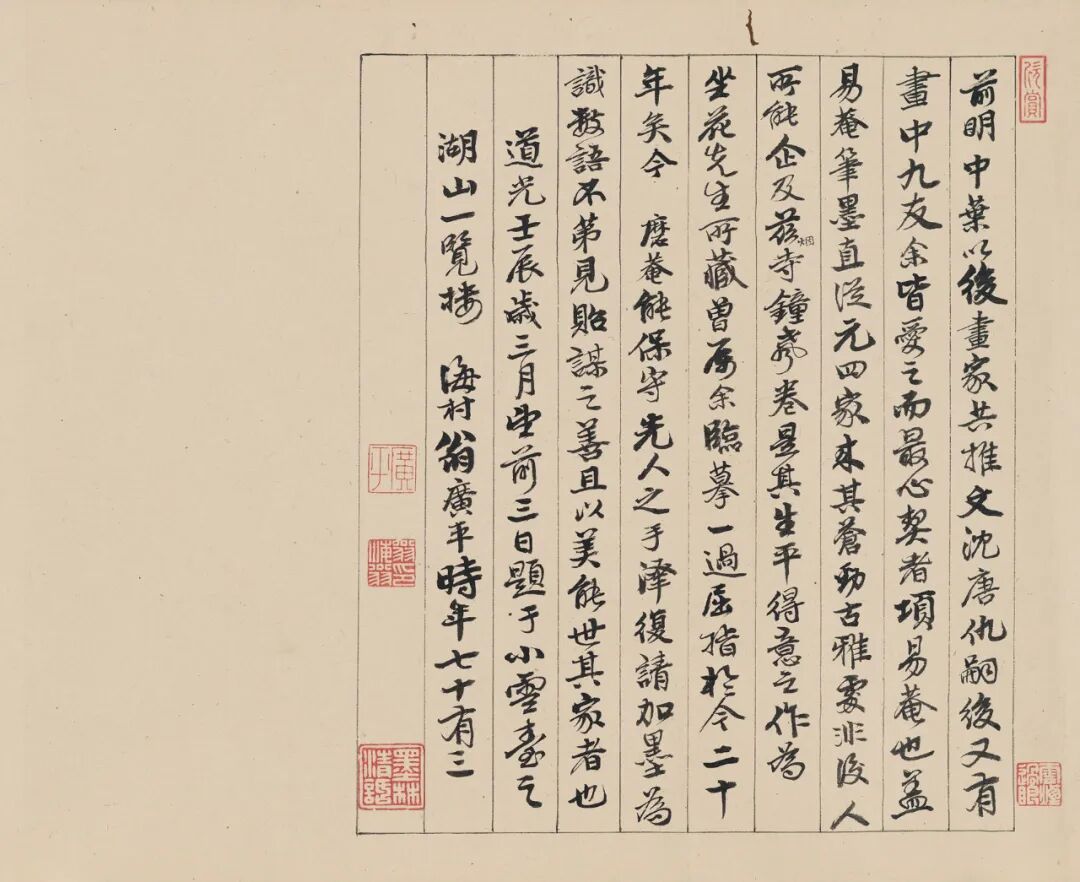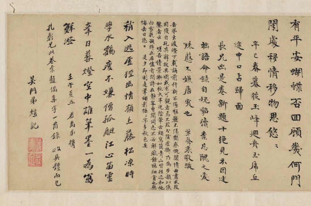 其中元人罗纮在元末诗坛弟子众多,罗纮于《山阴县志 罗纮传》有载。顾复《平生壮观》亦有记载:“秋山萧寺图绢卷几二丈,末小楷燕文贵……罗纮、萧规、黄守皆元人诗题。”纽约大都会博物馆所藏燕文贵(传)《秋山萧寺图》后的行书跋文,是已知唯一的行书墨迹。二者虽书体不同,但用笔细腻一致,且钤印完全相同。