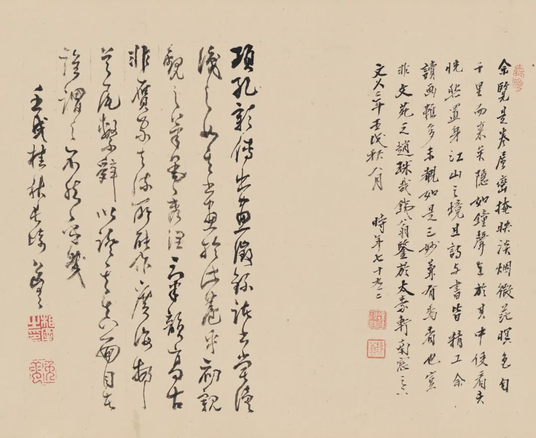 除本拍品之外,王鉴同一时期对这一题材另有两次尝试,分别是辽博藏1671年《竺溪结庐图》以及庞莱臣旧藏1675年《三竺溪流图》,可见王鉴对于摹古仿古的不同表达。