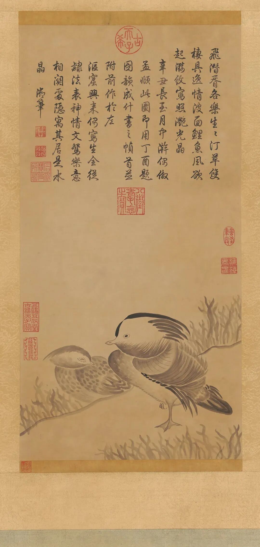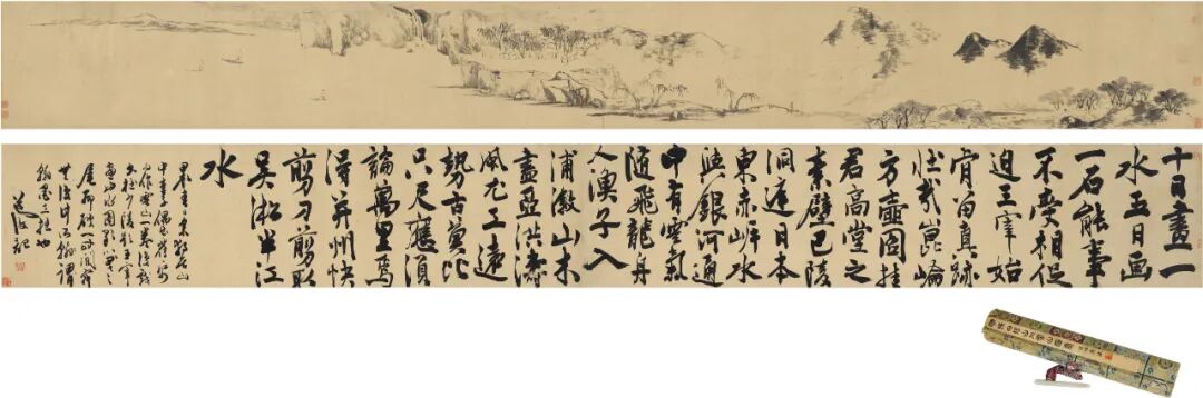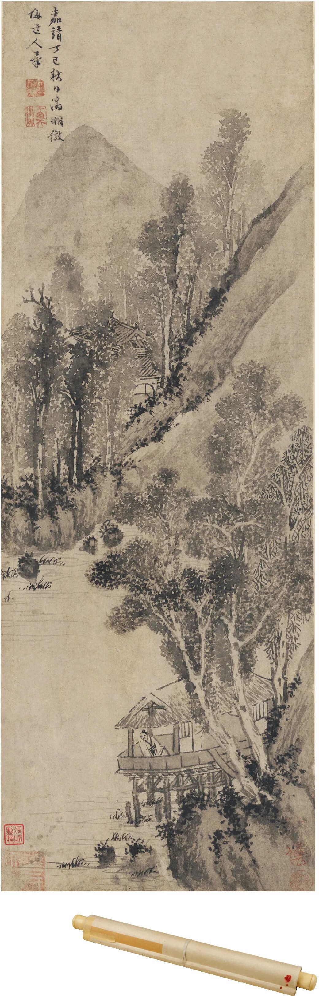古代书画部分,在该领域颇有建树的西泠印社呈现数百件古代书画佳构,可谓名家云集、重磅频出:文征明晚年摹习吴镇笔法的“粗文”代表作《水阁图》是研究文征明乃至明代绘画不可绕开的一件重器;市场仅见傅山传世书迹之绢本章草杂书卷;流传有序的《石渠宝笈》载乾隆帝御笔仿赵孟頫汀草文鸳图;市场已知唯一陈淳大字楷书卷,公藏仅南京博物院一件。南京十竹斋敬献明清时期黄慎、弘仁、唐寅等名家手笔。广州敬和的宋贯休《罗汉图》著录丰富、亦有可观。