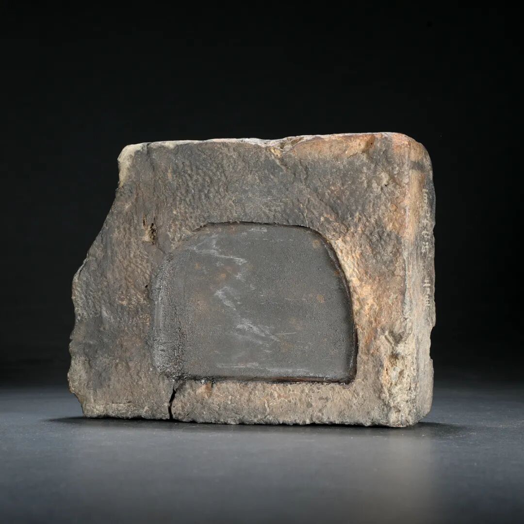 说明:以古砖制砚古已有之,至清代金石学兴起而滥觞。制作者大多选汉、晋之砖,因其多有图案文字,高古淳朴,极具赏玩价值。此砚以古残砖改制,开拱形池。一侧有“百九十七砚”隶书铭文。此砚包浆醇厚,气息高古,置之案头,雅意弥漫。配楠木天盖。