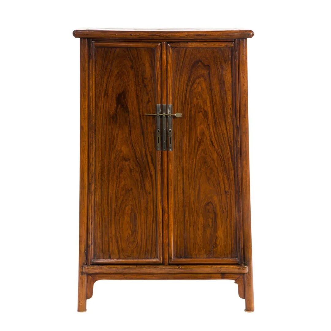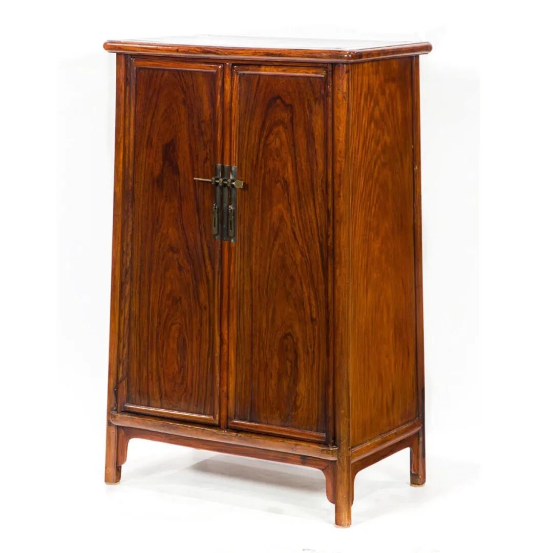 另一重点拍品为此件清代黄花梨圆角柜,橱面及柜门尽显黄花梨木纹之华美。