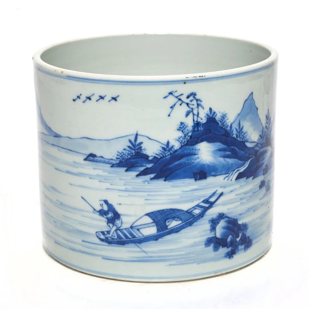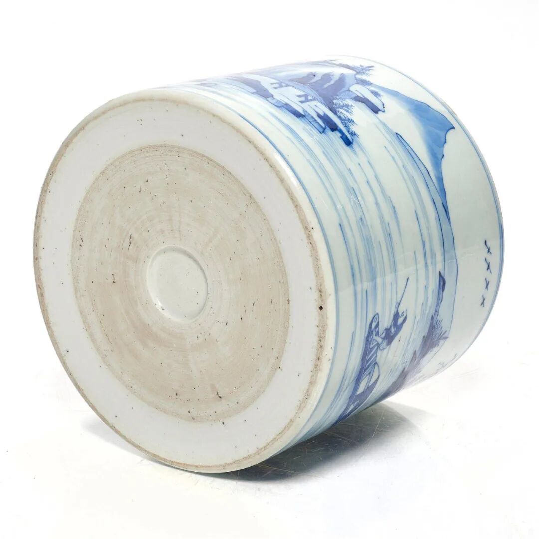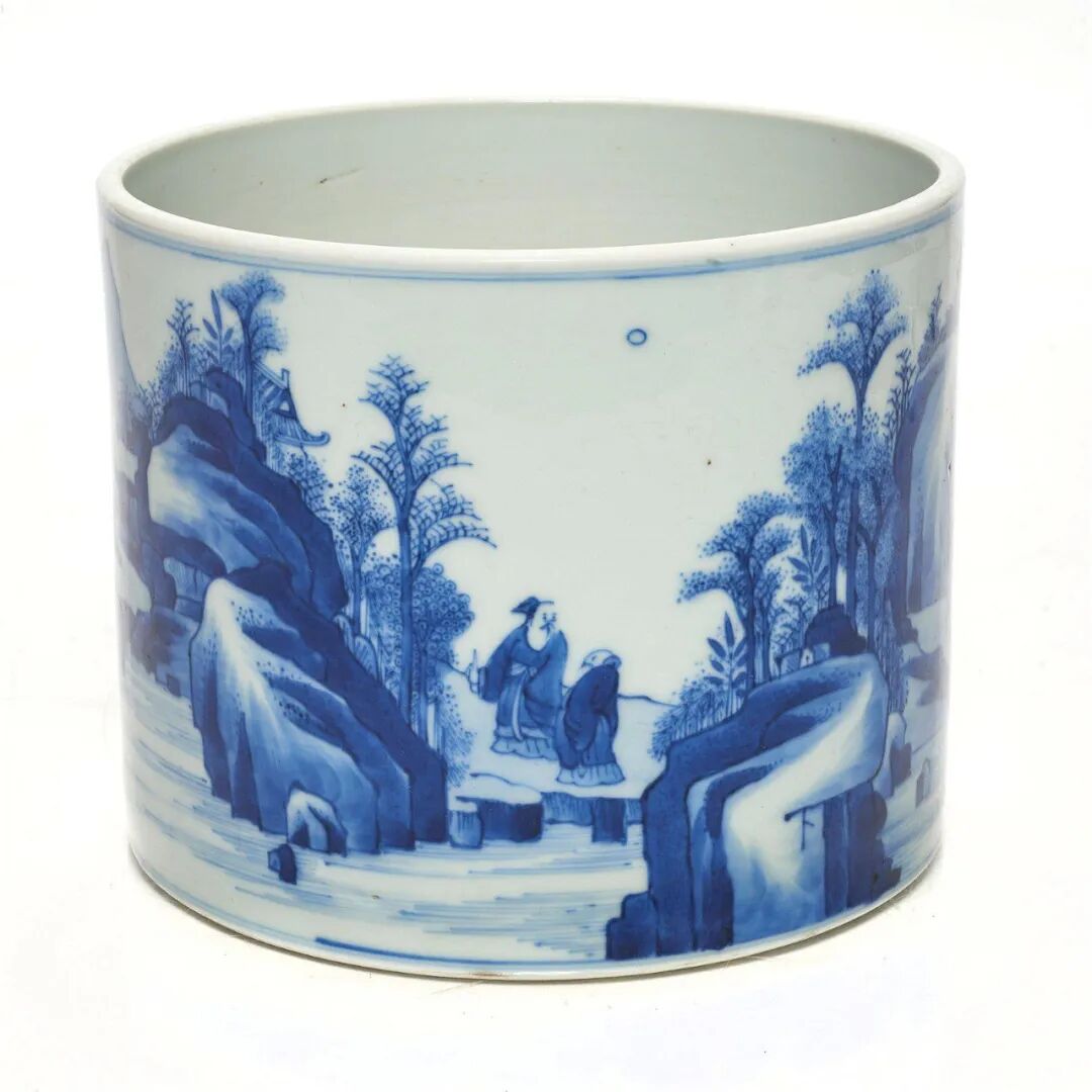 瓷器部分将由一只清康熙青花人物山水笔筒领衔。笔筒直壁,玉璧底,底心白釉无款。背景山水层次分明,起伏跌宕,人物神情闲适,整体画面幽静雅致。
