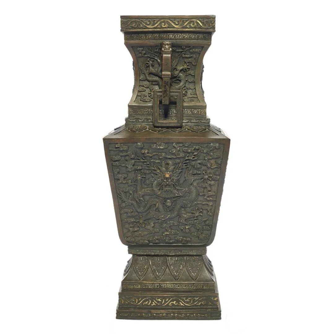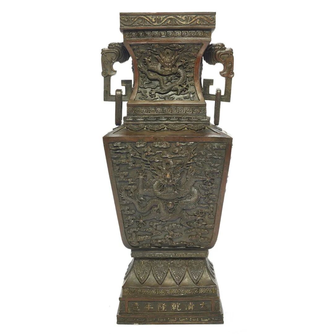 清乾隆 御制铜铸刻龙纹双耳活环方觚