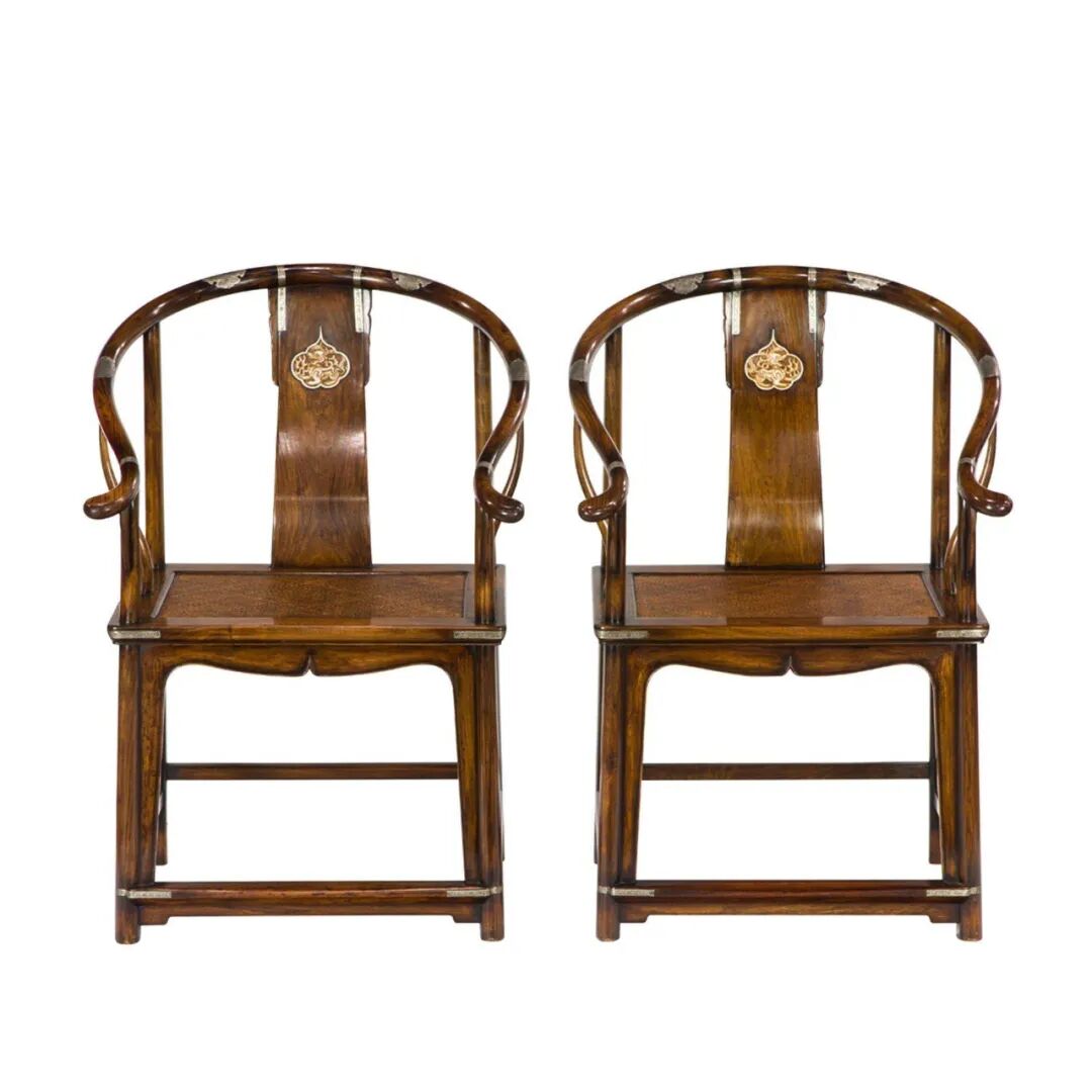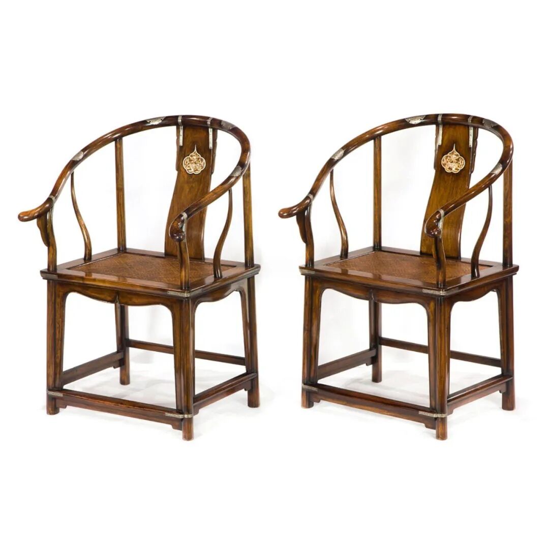 家具部分的焦点拍品先来看一对清代黄花梨圈椅。三弯式背板上部以兽骨雕刻如意型开光,方寸之内神兽祥云栩栩如生,灵动自然。拱形靠背和弯曲扶手装饰着梅花图案的白铜配件,尽显清代家具的精致富丽。