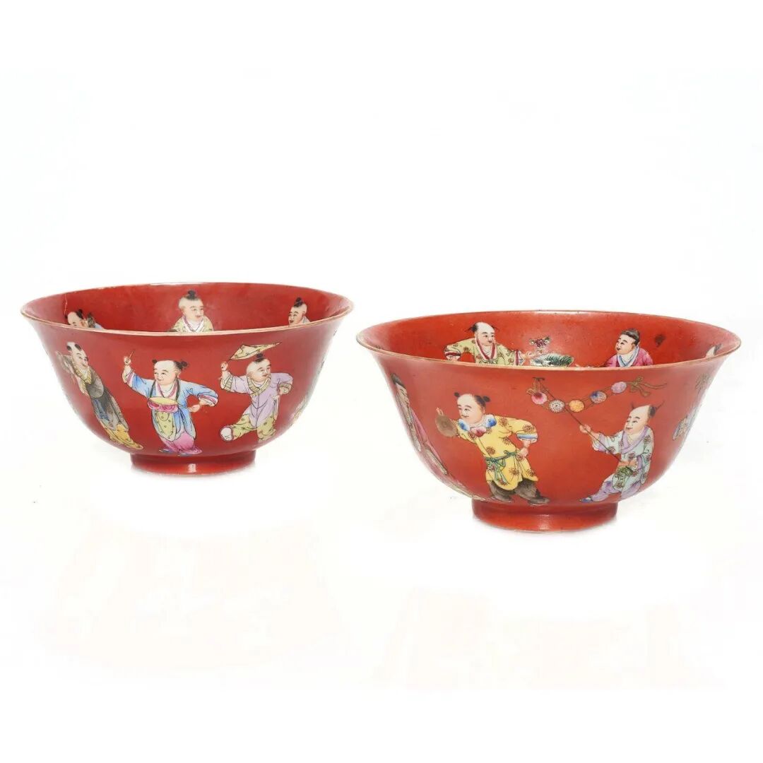 清嘉庆 珊瑚红地粉彩婴戏图对碗