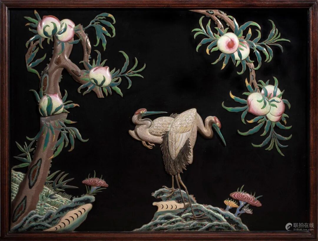 另一件御制精品为漆嵌掐丝珐琅仙鶴九桃图挂屏。以掐丝珐琅于黑地之上描绘对鹤栖于九桃之下,立于山石灵芝之上,寓意福寿连绵,万寿无疆。