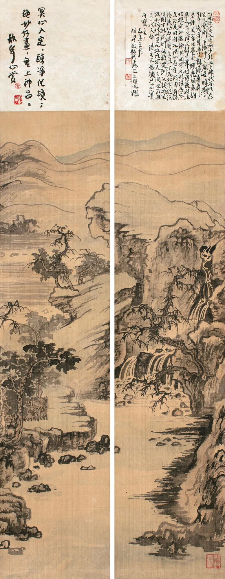 释文:蜀中胜概图四尺屏,四幅峨眉山月,拟高房山夜山图笔,写太白诗意。剑门秋色,予游踪未及剑门,兹考诸图,籍以意为之。青城叠翠,唐人咏青城诗,绿净不可唾者,具境可想见焉。巴渝初雪,巴蜀地处盆地,高山四垣,如在釜底。故寒流廻驾,不如严冬。予九载渝州,仅一见飞雪,至是始知凌竞之意。……
