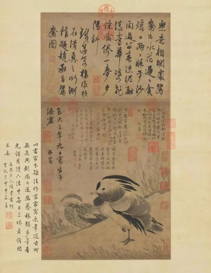 乾隆帝(1711~1799) 御笔仿赵孟頫汀草文鸳图拍品估价:10,000,000 - 15,000,000 人民币1.《石渠宝笈续编》第四十九,宁寿宫藏·六,清内府抄本。2.《秘殿珠林石渠宝笈合编》第6册P2490,上海书店,1988年。3.《四库全书集部 · 清 · 御制诗四集》卷八十五,清文渊阁本。4.《艺术市场所见<石渠宝笈>著录书画目》,上海书画出版社。5.《石渠宝笈珍品》卷二P128-131,上海书画出版社。根据北京故宫博物院藏品总目,乾隆帝临赵孟頫轴、册有六十六项。乾隆临赵孟頫《汀草文鸳图》最为特殊。1777年,乾隆帝67岁,在赵氏原作上题诗。1781年,乾隆帝71岁,不仅临画,还新作一首诗,并录旧诗,同韵自和,即西泠春拍此件。诗画著录于石渠宝笈、御制诗集。本拍品所对临之作赵孟頫《汀草文鸳图》同为乾隆帝旧藏,是其极为喜爱之作。赵作画面上有乾隆帝丁酉年(1777)御题自作诗,而时隔四年后此诗再次题于本拍品上,并与其另一首自作同韵诗交相呼应于长题之中,可见乾隆帝不仅自矜于其画笔,更兼及自己的诗才和书艺。在绘画方面,此作亦是乾隆帝精心之创作。乾隆帝秉持的态度却一丝不苟,此作所选用画纸为精心准备,其尺寸与原作同宽,长度与原作画面加上诗堂尺寸相当,画纸下方可见接纸痕迹,应为所用老纸本身尺幅有限,特意裁出另一小段接上以全画幅,以为画幅上方御笔题诗留出相应空间,可见创作前乾隆帝实已成竹在胸。此作应未假以能臣画师之手,是为乾隆帝本人亲笔创作,更显珍奇。据《石渠宝笈》所载,本拍品为乾隆自藏于紫禁城宁寿宫,实为其自满得意之作。