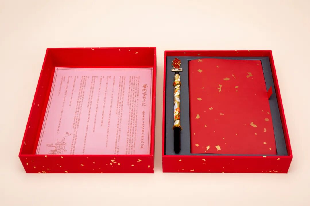 “翰墨”意同笔墨,“承光”喻义继承发扬笔墨中的精髓,继承古人笔墨,以通达古人文章,与古人会心。朱红色烫金布面礼盒,形端色正,内含笔墨纸砚章。笔是纯狼毫与纯羊毫的对笔,为红木笔杆,满足不同材质审美需求。手卷画心为洒金手工宣纸,已装裱。墨是二两重纯桐油烟云龙墨条,砚为宋坑夔龙纹门字砚,章是桃花红老挝石素方章。
