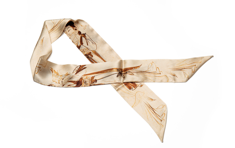 《雪衣女图》是张大千仕女图的代表作,以白描技法描绘了杨贵妃戏玩鹦鹉。画中杨贵妃丰腴婀娜,雍容华贵;线条流畅劲健,墨色浓淡得宜。丝巾由100%真丝印制,手工缝纫,可做领带、丝巾、领结、发箍、发结、腰饰、手柄绑带等多重之用,力求高度还原荣宝斋馆藏张大千《雪衣女图》的神韵,借以此机,向大师致敬,将这幅时代巨作带给每一位传统文化爱好者。