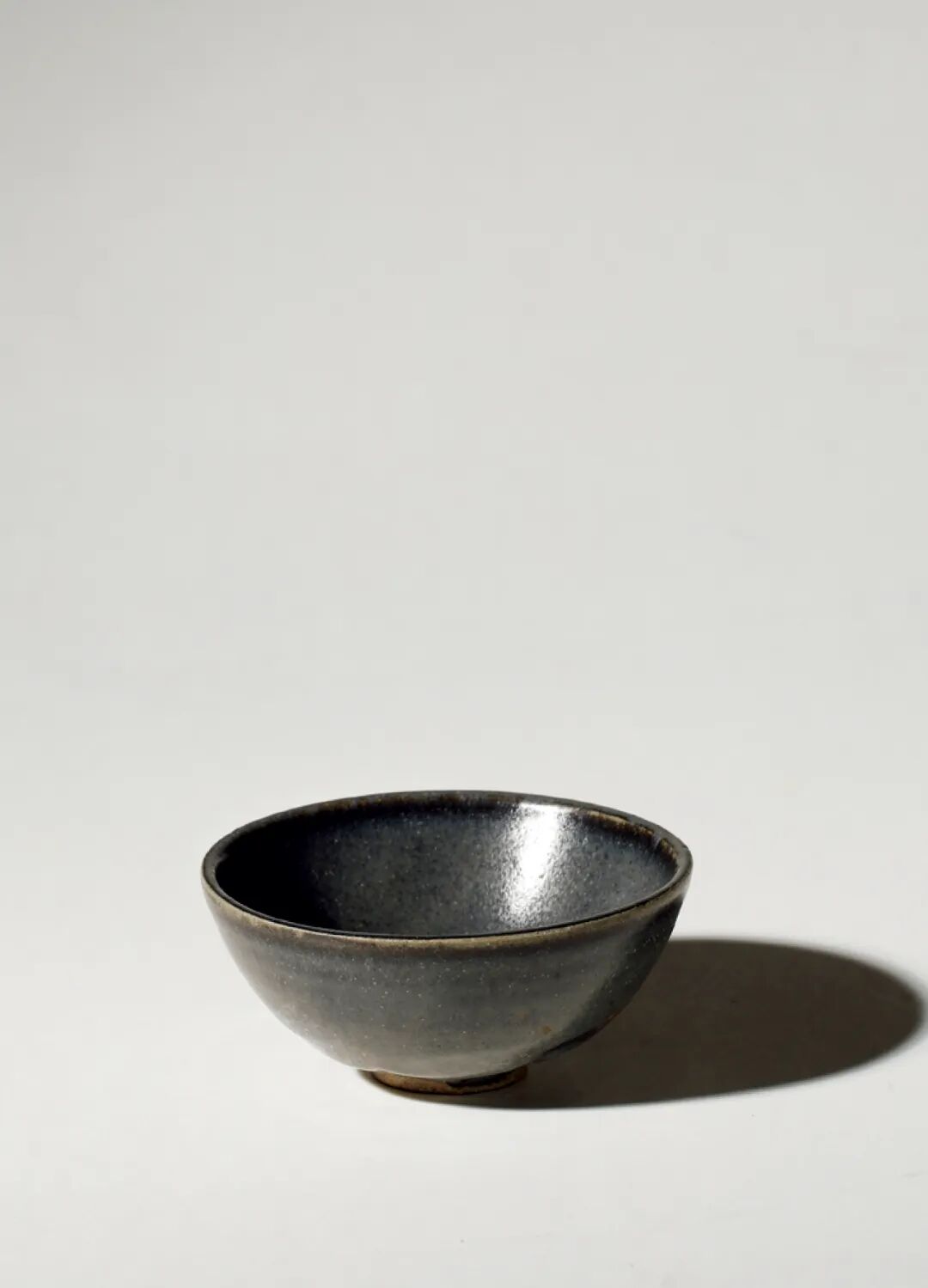 此碗敞口,弧壁,浅圈足,做宫碗形。盏里施满灰黑釉,盏外施釉及底,深褐色铁足,修足规整。通体施黑釉,釉色深邃如漆,釉质润亮有如凝脂。“灰背天目”也称“灰蒙”、“灰冠”、“灰担”、“灰潜”等,是日本用以形容与建盏同类的那种表面蒙着灰色的器物名称。灰介于黑与白之间,进可有黑釉之无穷魅力,退又含白色之神韵,这种可进可退的颜色,恰也应了宋代一个独特的审美观照——涵泳,游离与黑白之间的灰。