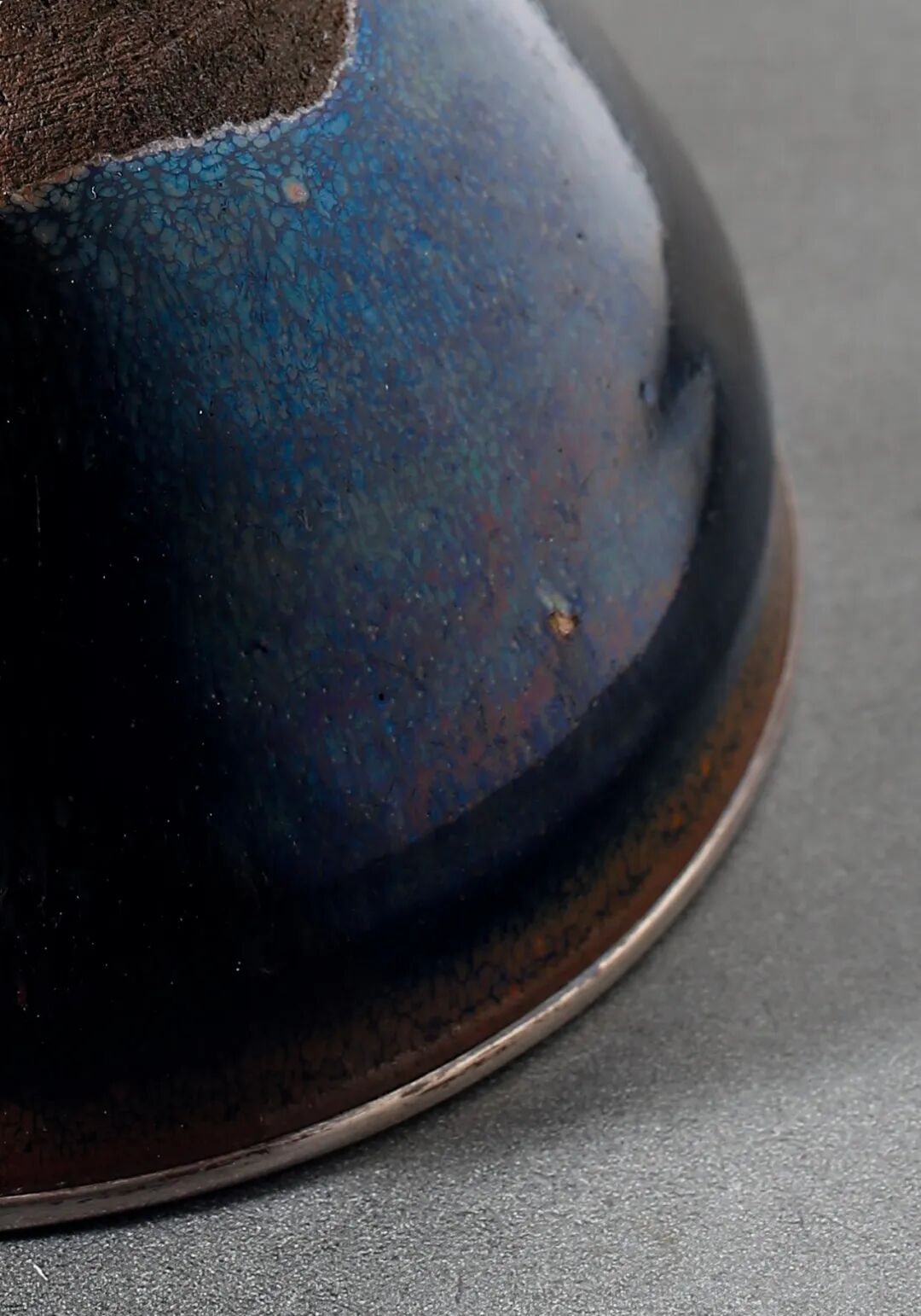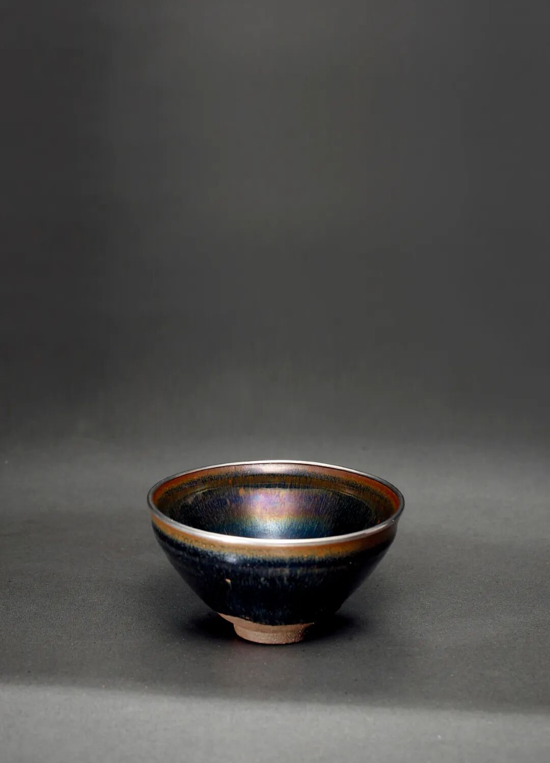 盏敞口,斜腹下微收,圈足。通体施黑釉,釉质滋润光亮。其釉面密布金黄色条纹,形似兔毫,伴有五彩宝光,隐隐闪耀着银色光辉。口沿镶银扣,口沿处呈现褐色釉面,如一圈星河,绚烂夺目。古时,黑釉茶盏多于佛寺,用之奉茶以养身心,茶盌质朴素雅,合适作为供佛仪典之器。盏沿下一圈微敛,为持用方便而设,胎厚扎实,保茶汁温热而不烫手,釉黑润亮,托称宋时点茶击拂茶水后,所得茶面细沫,白黑相映,瞬息美哉。
