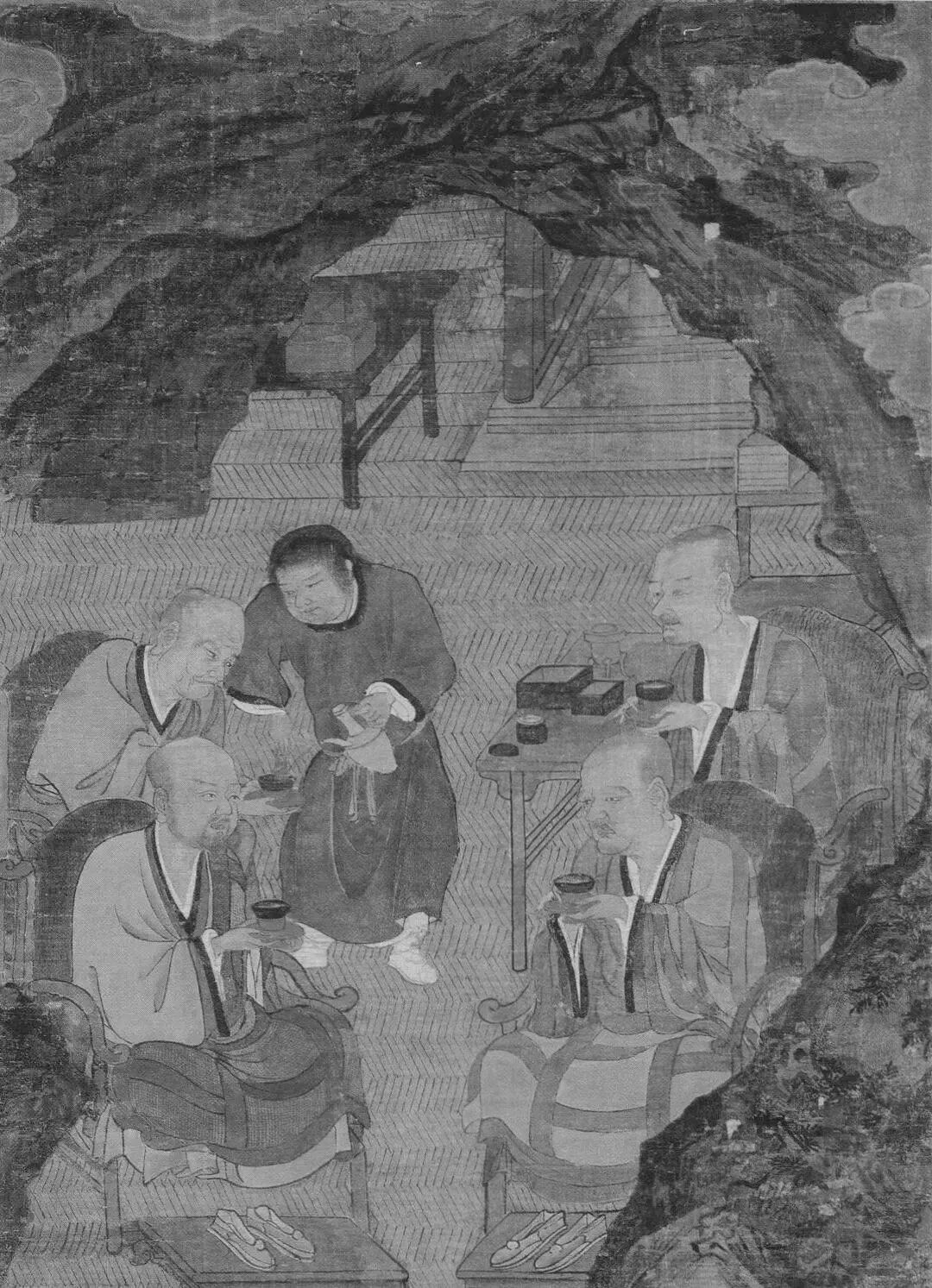 明末清初诗人曹溶写过《兔毫盏歌报陈若水》,诗中有一句“建安黑窑天下奇,土质光怪欺琉璃”,曹溶所见的建盏光彩奇异,堪比晶莹剔透、流云漓彩的琉璃。由此可见釉面带彩光的建盏并不是生来有之,而是独特的釉面成分,加上从宋至今近历经千年的传承使用才形成的。其实釉面带彩光的建盏比钧窑更为稀有,值得珍贵!建盏釉面的彩光现象,笼统来说,是在一定光线条件下,建盏釉面的同一位置同时呈现出多种色彩的光泽,是釉面经年久远形成的宝光。在南宋时期,饮茶的风俗在禅寺中广为流行。南宋周季常作、于南宋时期即传入日本大德寺的《五百罗汉图》中就有一幅表现四位罗汉饮茶的《吃茶图》,实为当日僧人用建盏饮茶的生动写照。与佛教绘画一样,茶道和相关的茶具也在此时藉由日本游学僧人带回日本。而此盏为何会被日本茶道家如此珍重,亦有原因。茶碗的碗心在茶道中称之为“镜”,此处釉面尤其要求平滑均匀。对照以上标准,此碗符合规制,堪称为传世的名碗之一。尤其是釉面宝光,光彩照人。更加值得注意的是,此碗的斑纹色泽随光变幻,宛如七色彩虹,熠熠发光,好似呈现“曜变”的神秘之趣,幽蓝悦目,不禁令人赞叹古物有灵,窑火天成。馆藏资料中,《唐物天目》收录一系列天目盏,包括数件日本国宝及福建器物作例,其中国立京都博物馆与德川美术馆藏禾目建盏,类同此件拍品。传世建窑兔毫盏现身内地拍场亦是甚少,通体带彩光者更罕,可兹参考的一例是北京保利2021年6月7日拍出的日本藤田家族世传蓝兔毫“天目”茶盏,成交价为2012万。正是因为百年流传,世代珍用,此盏才形成五色宝光。