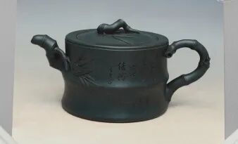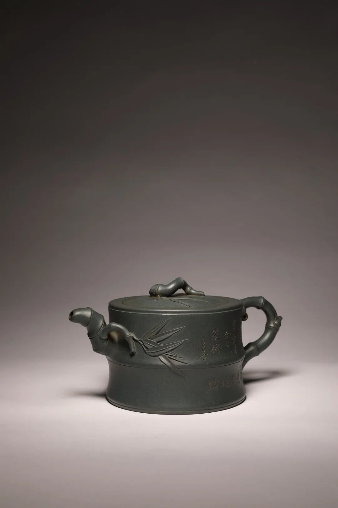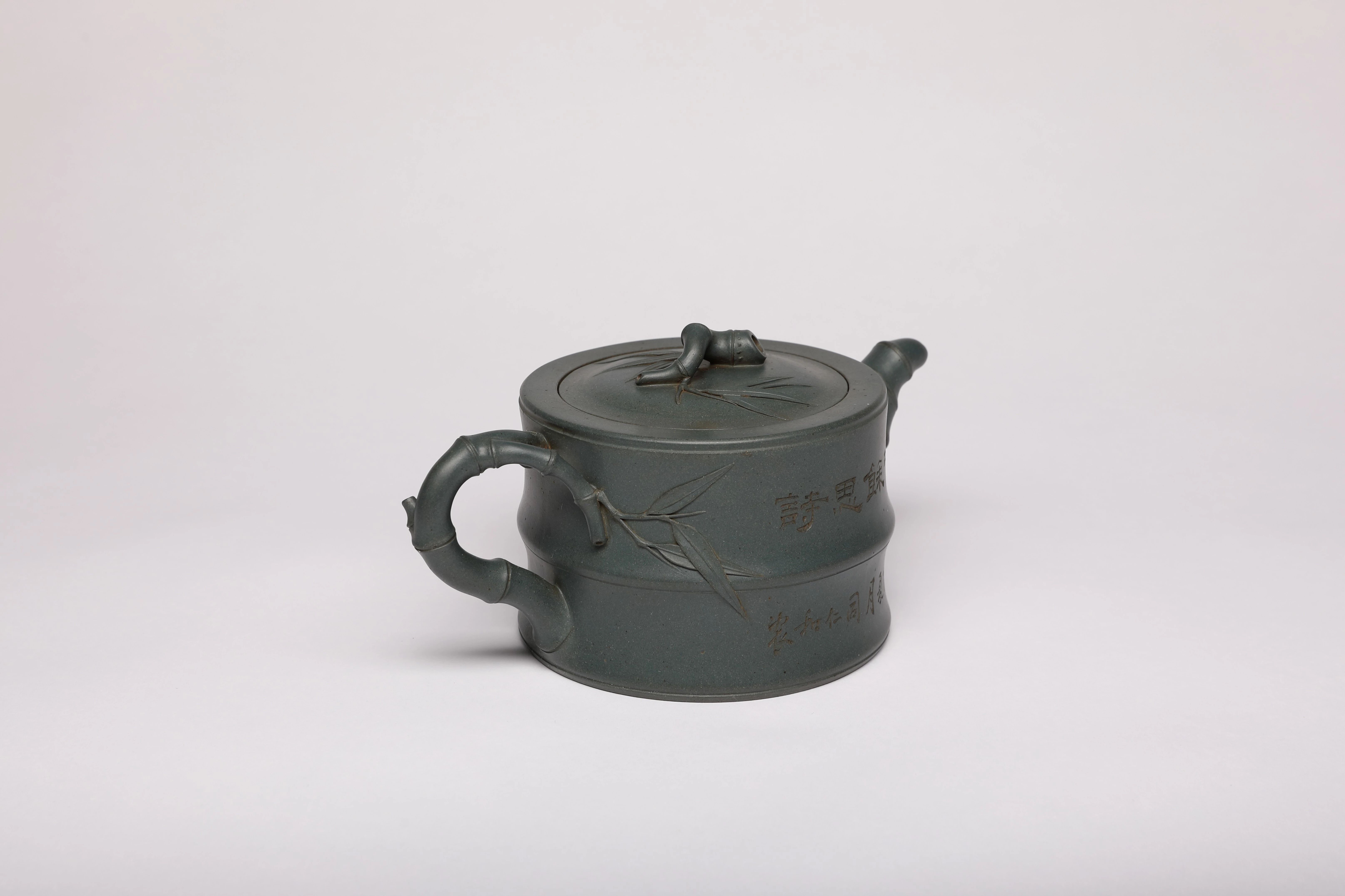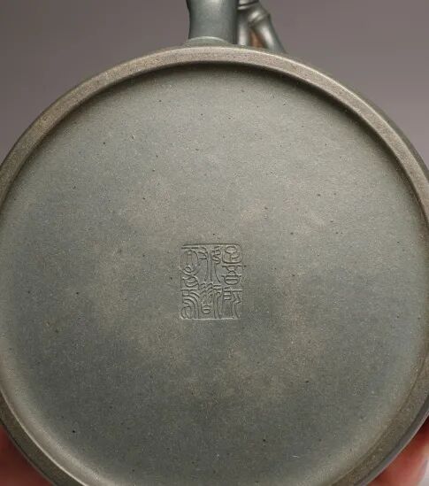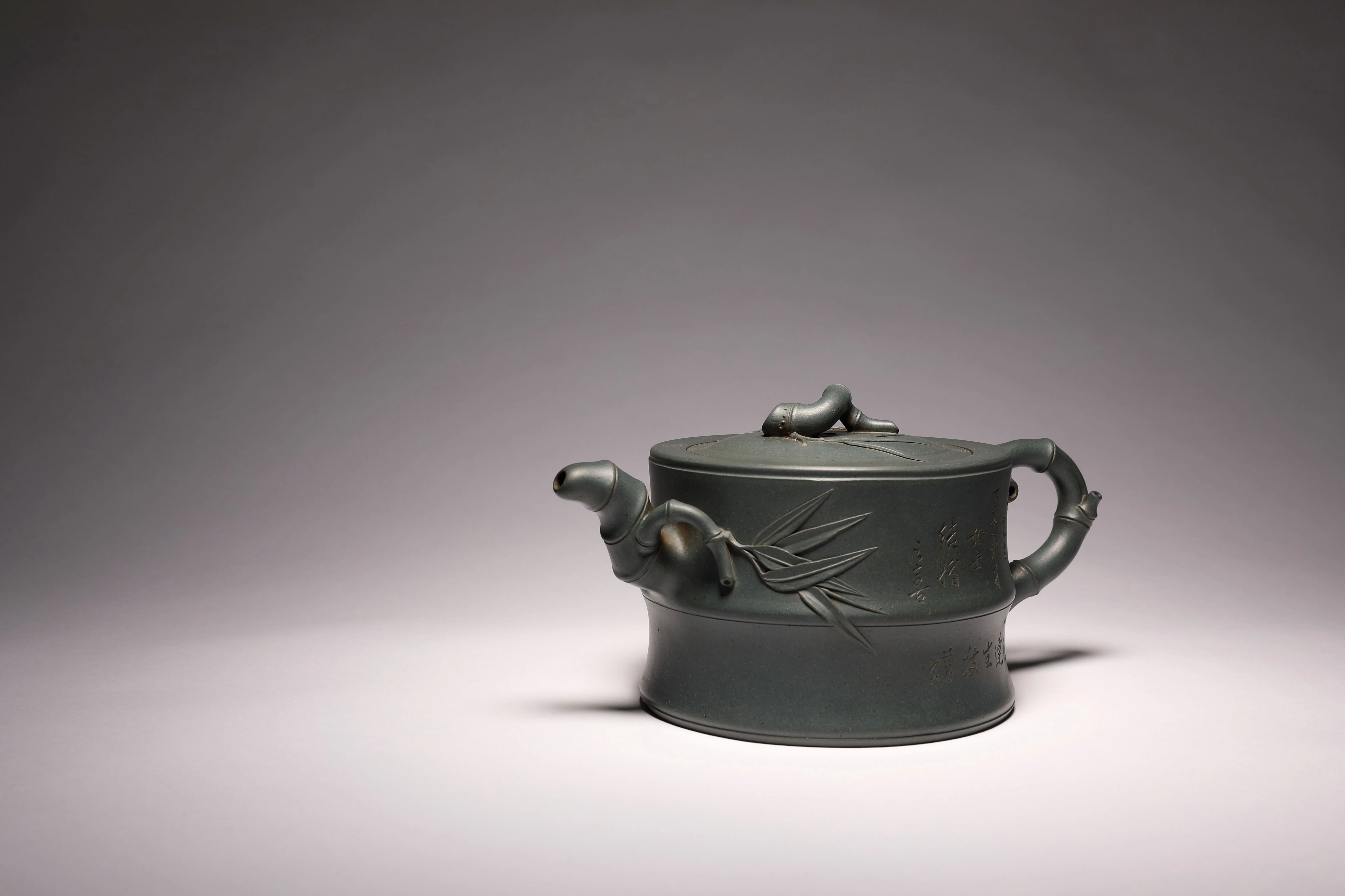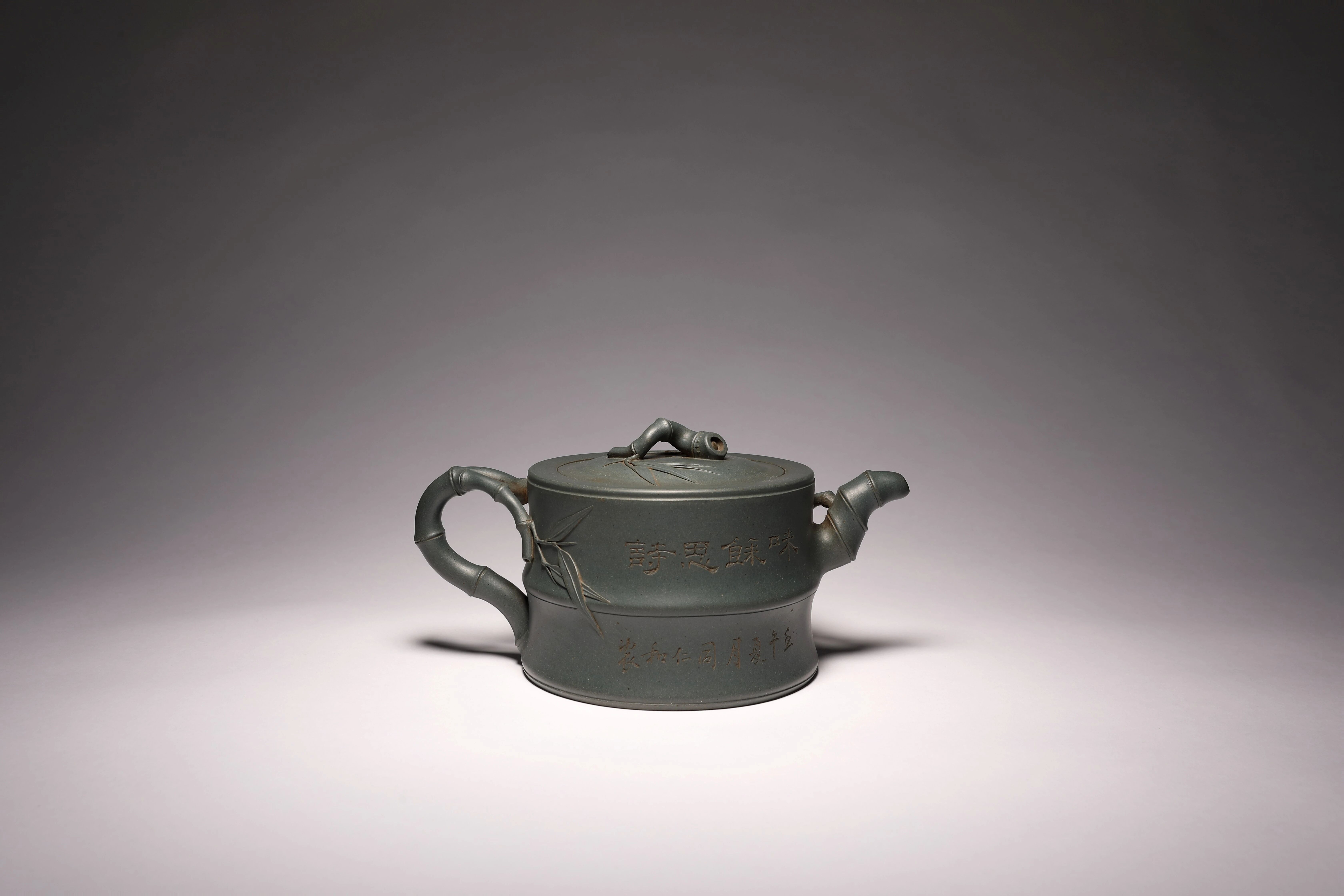 民国墨绿泥制器非常稀有,因其色沁心,温润如玉而著称于世。竹段为身,取竹之虚心可受;竹枝为壶把、钮、流,取竹之坚韧不拔;竹叶贴塑尤其特别,层叠交错而叶尖如芒,轻盈秀丽。整体工艺极为利落细致,气质温雅从容,是顾景舟先生花器作品里的经典之作。