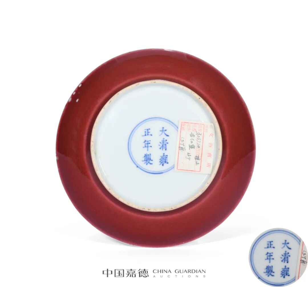 有清一代颜色釉尤以雍正朝为最,不仅是釉色纯美靓丽,而且与器形搭配更见相得彰显之妙。此器敞口,弧腹,浅圈足。盘外壁施红釉,釉色鲜艳纯净。口沿处呈粉白“灯草口”,底部青花双圈内书“大清雍正年制”六字双行楷书款,为雍正红釉佳作。