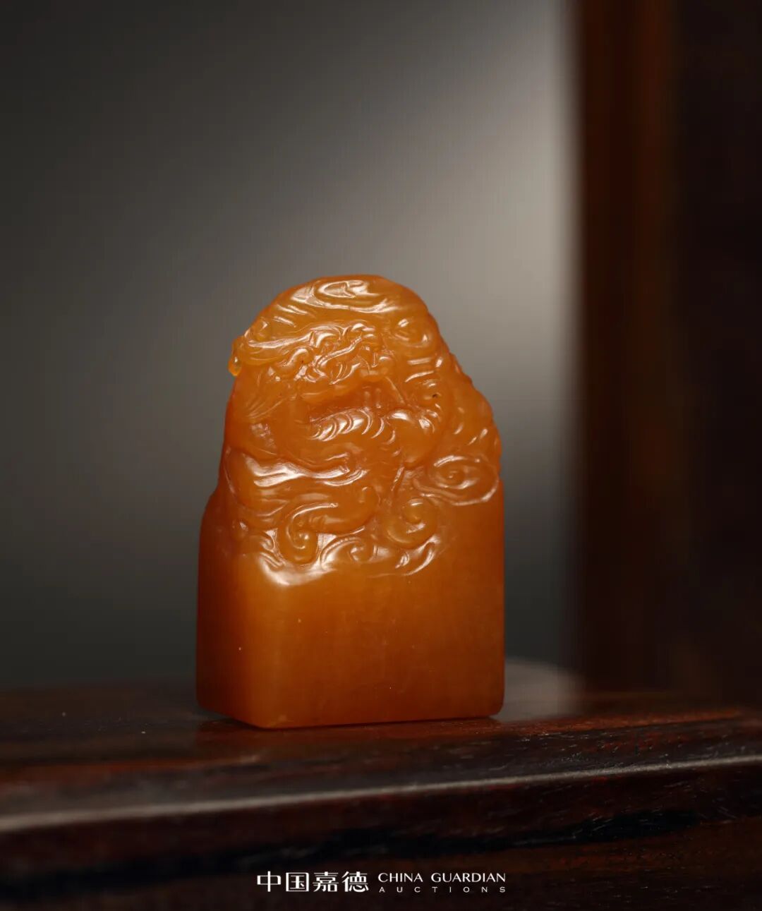 此件寿山田黄石螭龙钮方章,石色黄中透红,浓郁纯正,其质地莹润细腻,如蜂蜜之感,石材形制方正,顶部巧雕云龙纹,其祥云流动,螭龙顾首,英姿神武。