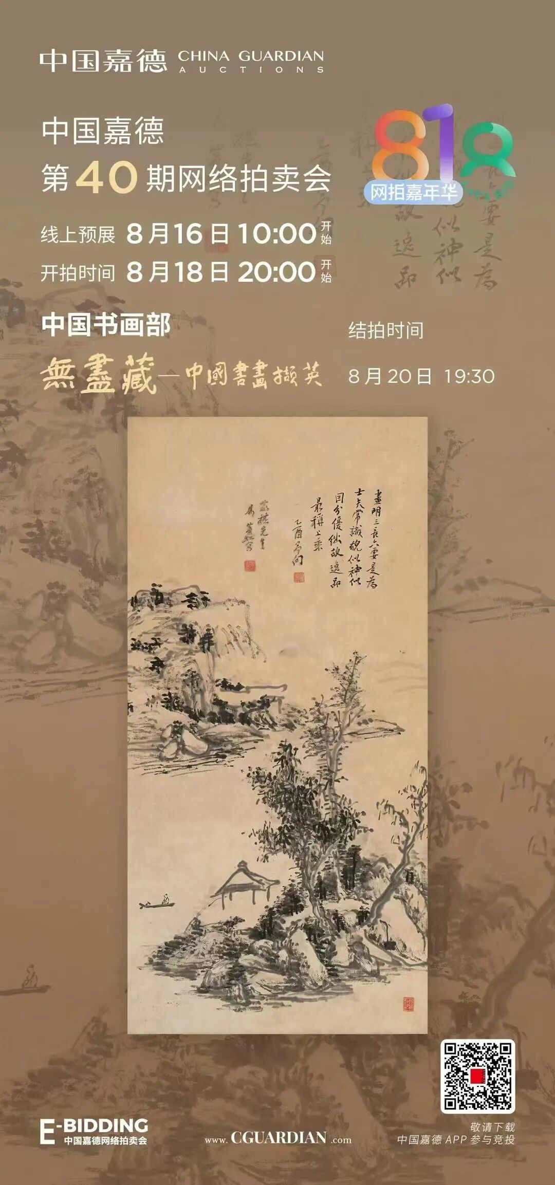 初秋的“818网拍嘉年华”中,由中国嘉德中国书画部主理,以“无尽藏——中国书画撷英”专场领衔,推出包括“嘉画(一)”、“嘉画(二)”、“蔡志忠绘画作品专场”、“今水墨(一)”、“今水墨(二)”共6大专场近350件佳作。
