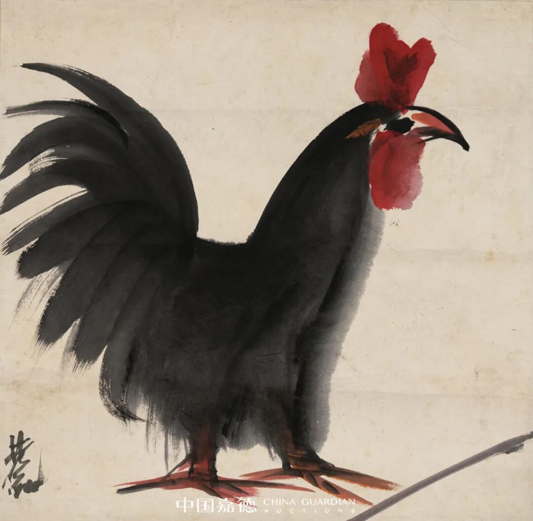 吴冠中赞誉林风眠的艺术风貌独特鲜明,寓圆于方。在方形画面中,追求最大的扩展与最严谨的紧缩,在扩张与紧缩的张力中构成力的平衡。《雄鸡》图也是林风眠这种独特的审美观之呈现,雄鸡动态自然随意,优雅、含蓄,红冠与墨羽形成鲜明的对比。流丽的线条,椭圆形的构图,若干笔触的交错铺陈,使得构图及画面层次更加丰富。显示出艺术家是在对画中人物有了充分理解之后加以提炼才可到达纯熟、自信的表达境界。