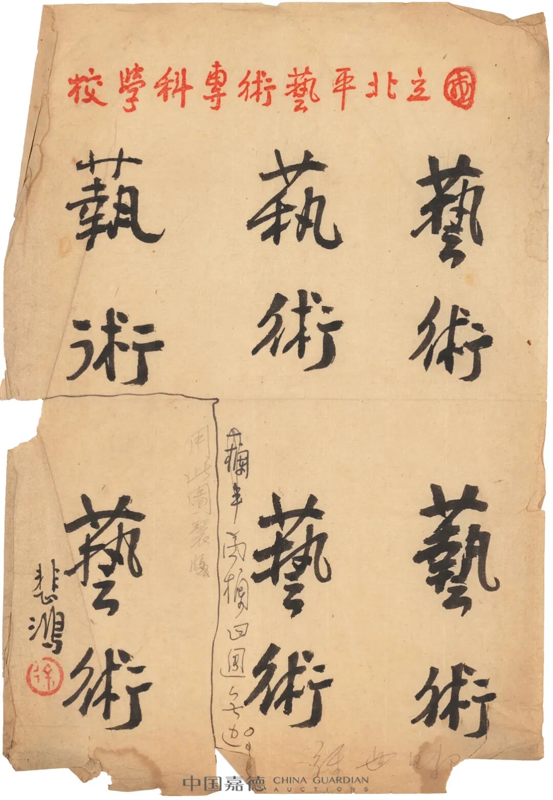 刘铁华(1915-1997),笔名王军、漆石舞、铁军等,河北蓟县人。1937年赴南京八路军办事处任交通员,抗战后曾在西安主持全国抗敌漫画木刻家协会西北分会的工作,主编《抗敌画报》。1942年到重庆中速文化协会任助理秘书兼艺术干事,并主持中国木刻研究会工作,任常务理事。这一时期曾主编《美术家》杂志,《国民日报》、《新蜀报》木刻副刊。主编北平《经世日报·艺术周刊》,每星期日的周刊约八开篇幅,可容六千字。此帧“艺术”即为《经世日报·艺术周刊》题名,变换多种字体,足见徐悲鸿对其重视有嘉。