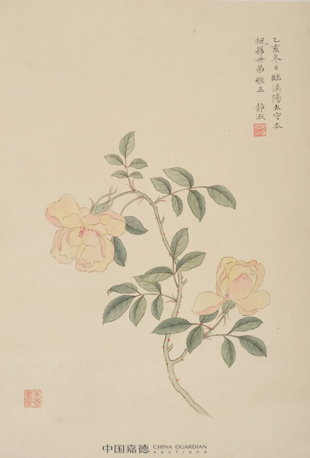 “梅影书屋”主人吴湖帆与潘静淑都出生于苏州的名门望族,潘吴的结合带来丰厚的珍藏,将“四欧宝笈”,宋汤叔雅《梅花双鹊图》与宋刻《梅花喜神谱》同贮,“梅影书屋”之名由此而来,夫唱妇随、相映成趣。潘静淑以工笔花鸟题材为主,偏爱摹古,画风细腻优雅,造型生动传神。她的画作极富天才,不是那种近代文人画的写意之作,而是“神韵超逸,窥宋元藩篱”的中国传统国画。本幅《月季》清雅、温婉、秀丽,工谨灵动,文雅淡逸,创作随性而又自由,正是画为传情无声之诗。