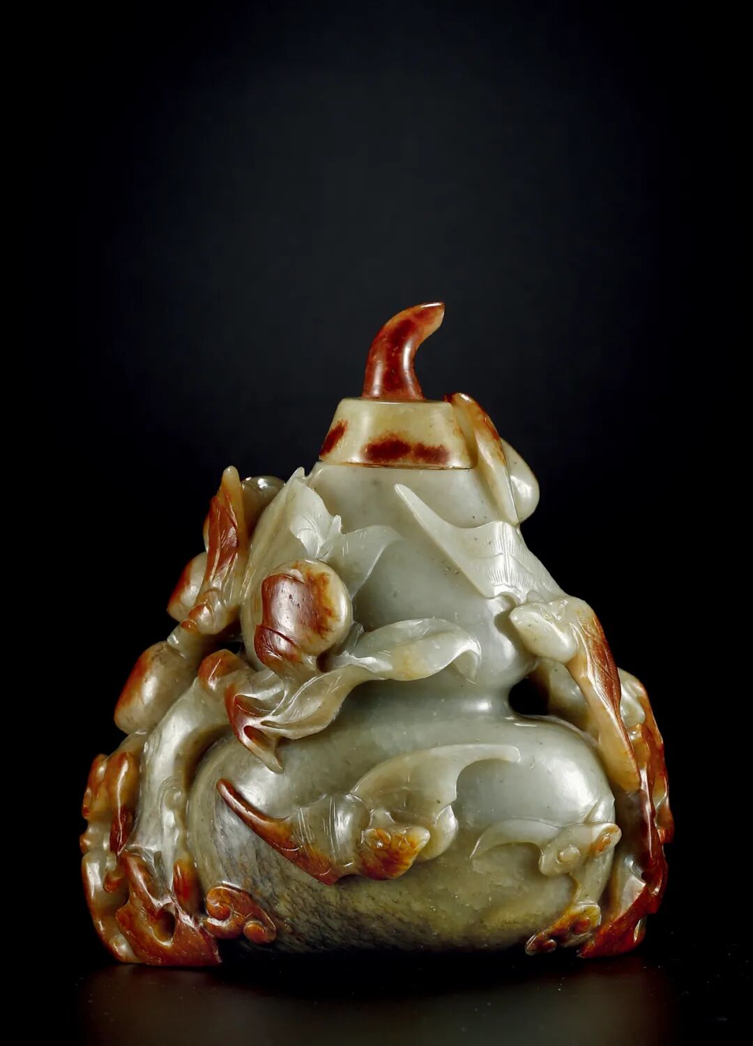 明·白玉留皮巧雕五福临门寿桃葫芦瓶