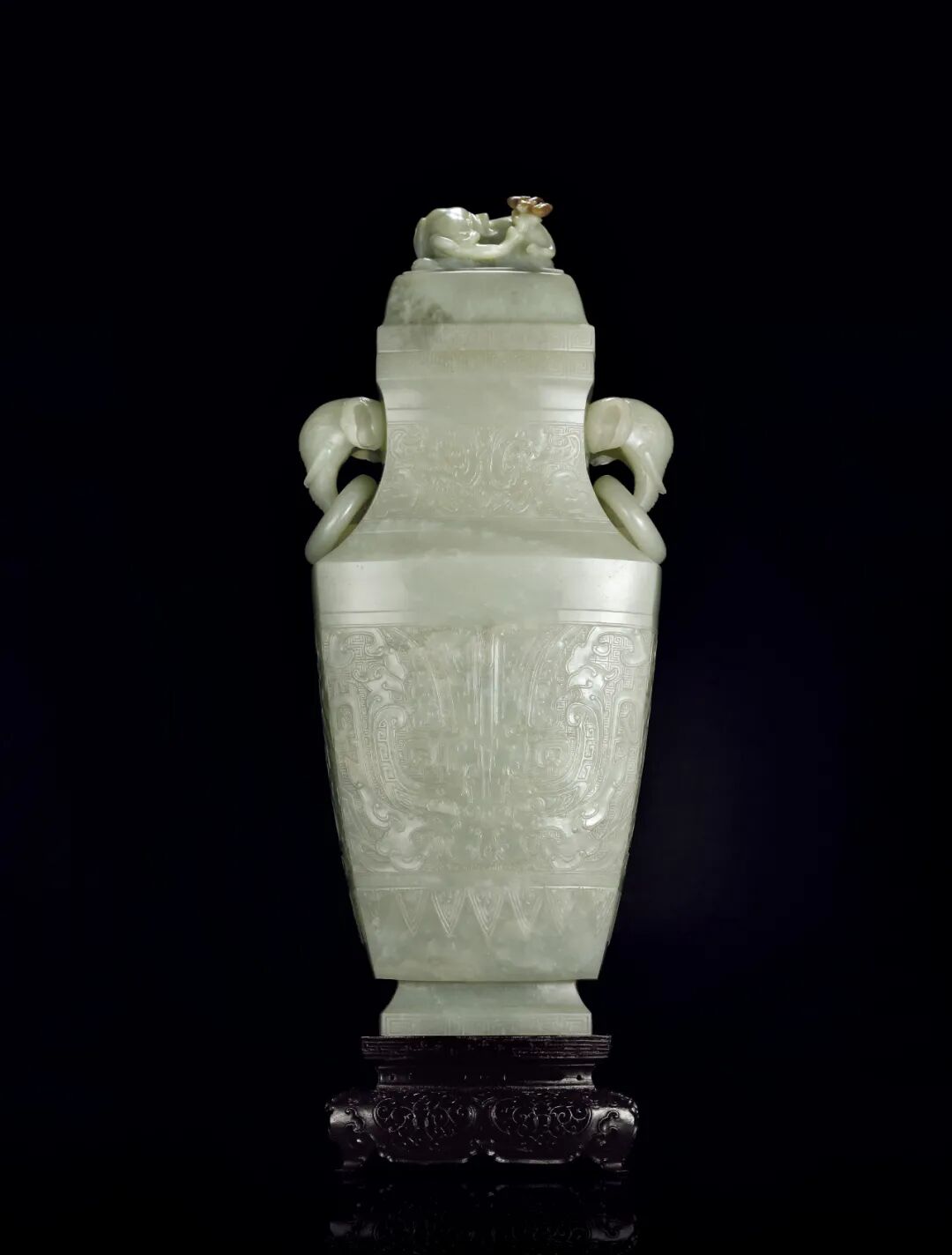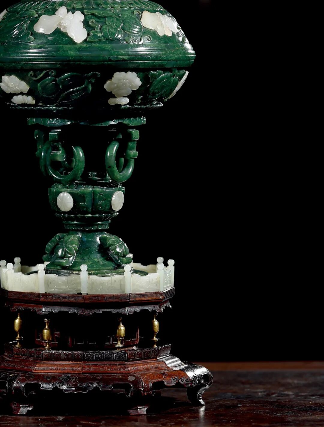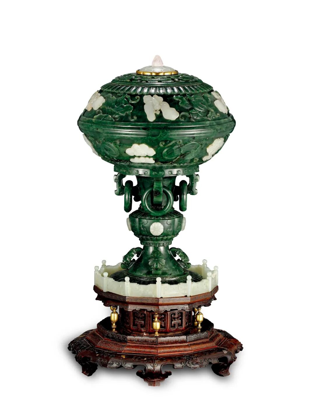 清乾隆碧玉镶白玉瓜喋绵绵图活环耳摆件与乾隆白玉仿古蕉叶纹兽衔十二活环耳尊亦为本场次亮点拍品。瓜喋绵绵图活环耳摆件曾珍藏于罗马 S.Bulgari,其玉质之细腻,色泽浓郁盎然,雕琢之精良,各方衔接得体,浑若天成。造型古朴中不失灵动, 极尽纹饰之能,处处显现古雅高贵之美。俯仰间无不见其和谐流畅之姿,古朴之风与华贵之态融为一体,颇为难得。