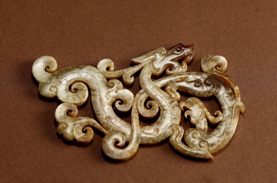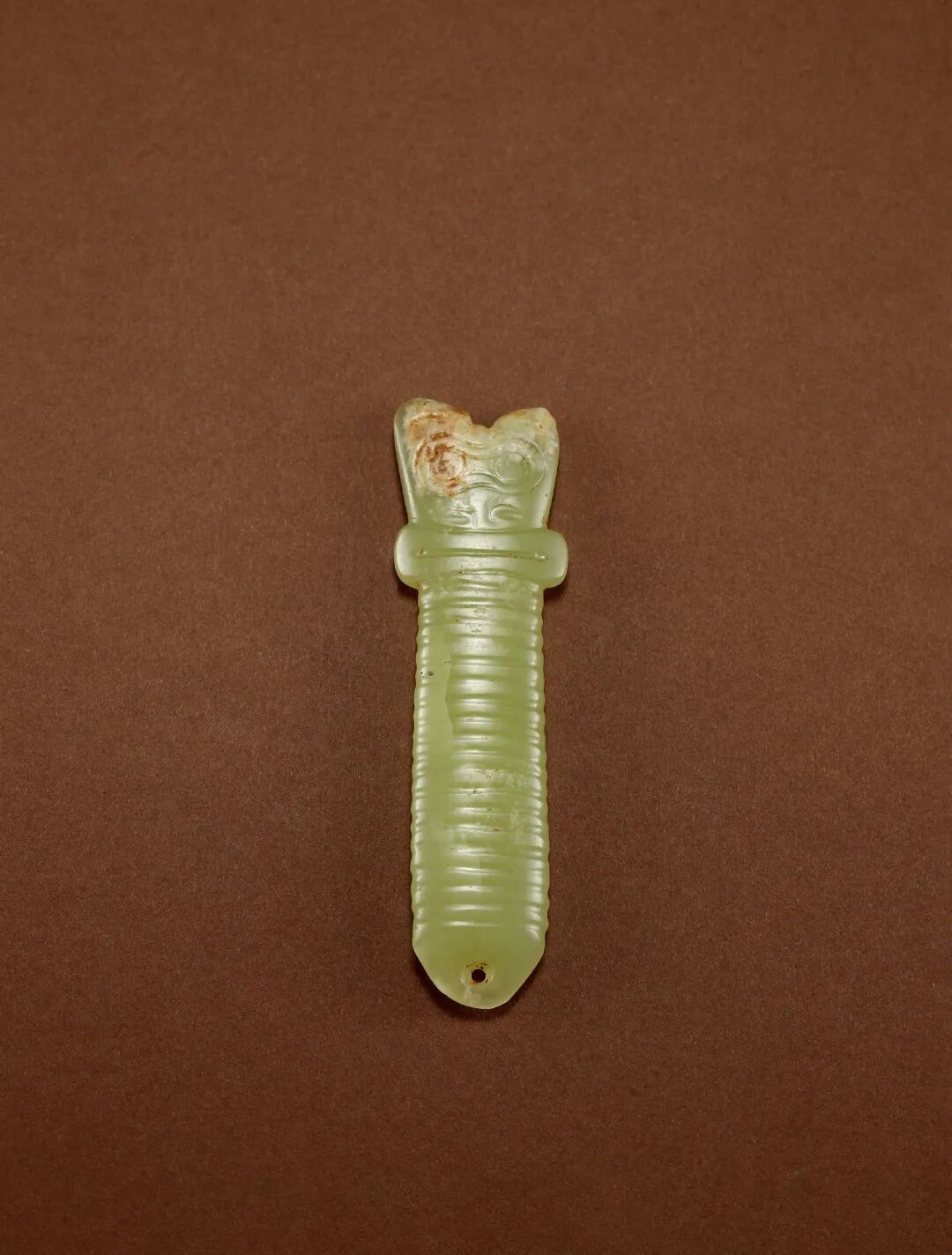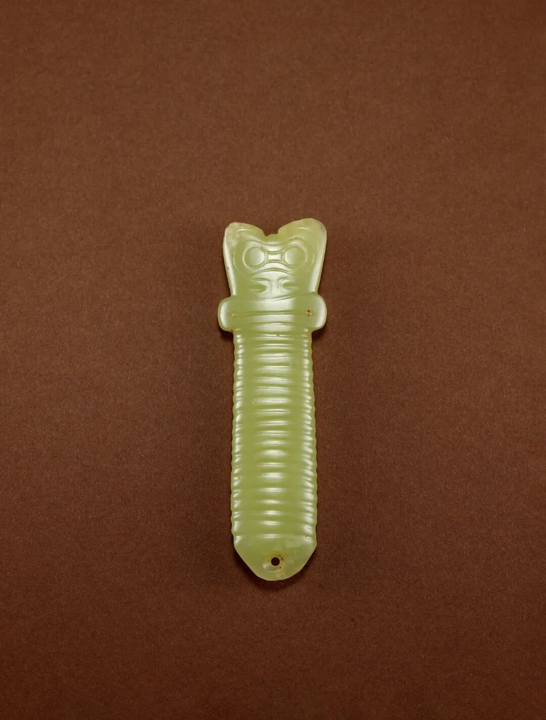 说明:黄玉质,局部有微沁。器身中间微微弧凸,边缘较薄,形若“Y”字,头部雕琢一兽面纹,开叉为兽耳。耳下为圆圈形双眼,口微张,嘴角凸出体外。头部以下雕琢多道凹凸的平行瓦沟纹,下端渐薄,似榫部,上有对转孔。此玉佩造型神秘而高古,具红山文化玉器特征。