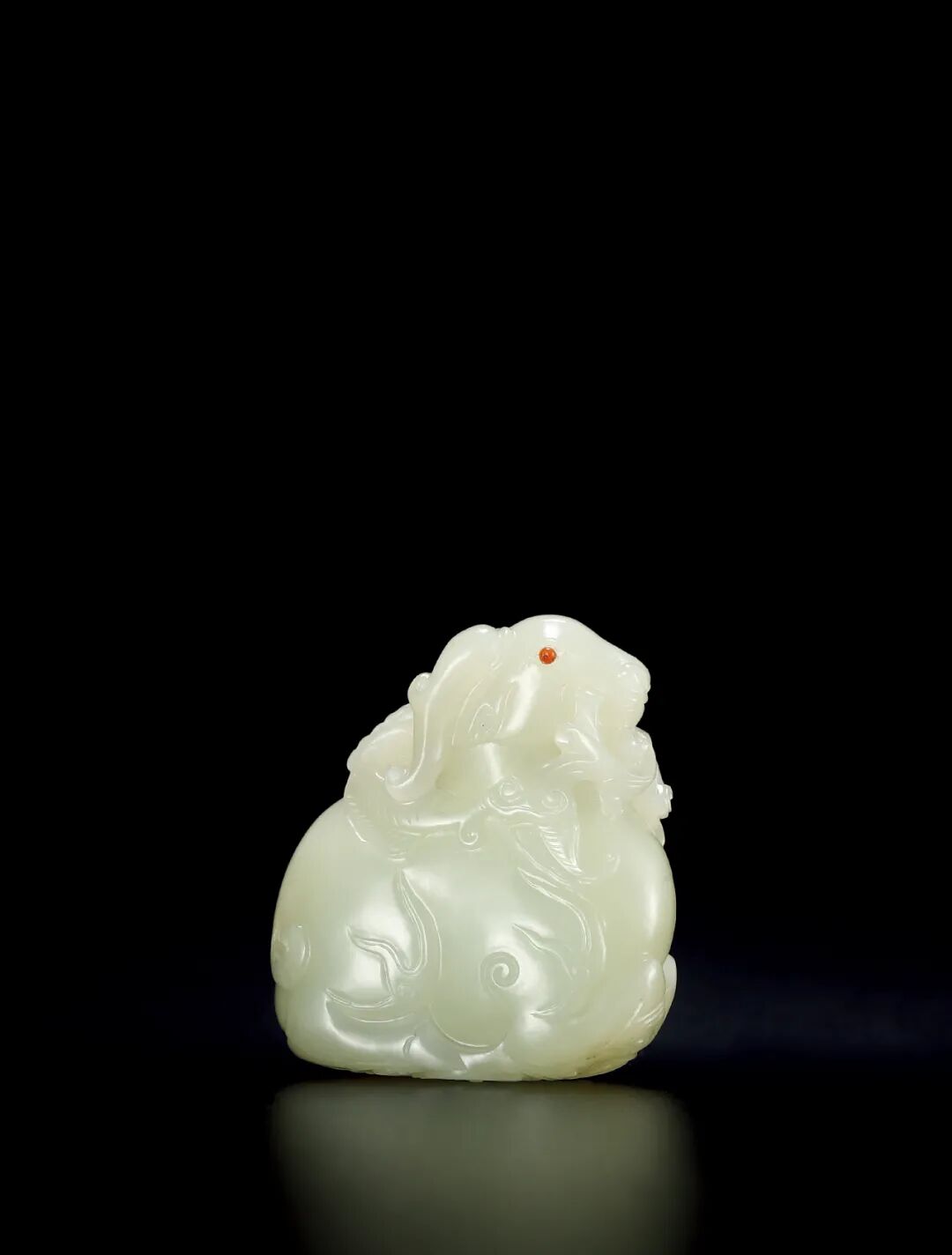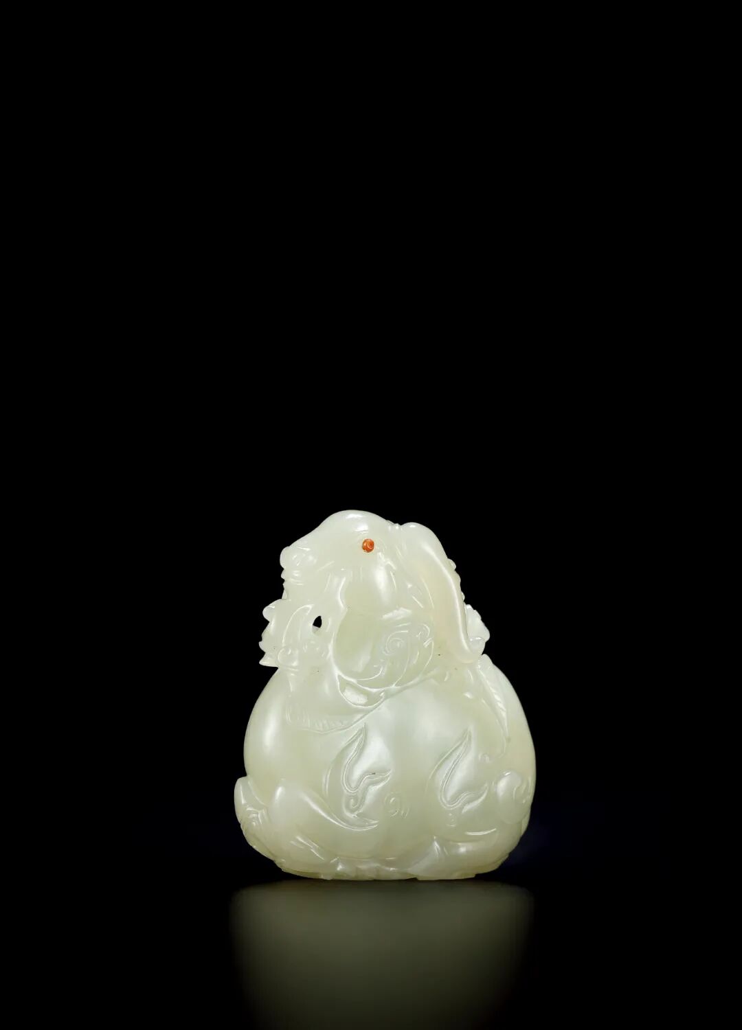 说明:以上等和田玉圆雕而成,玉质润泽,几无瑕疵。瑞兽口衔一株灵芝仙草,双眼嵌红色宝石,从白玉的底色中透出闪闪的斑斓,赋予其灵动之感。双耳下垂贴首,两角卷长触着叶片,四足蜷卧,呈静卧而似有准备奔跃之感,足下浮雕圈圈祥云纹。造型圆润,雕工洗练,憨态可掬的形象令人爱不释手。