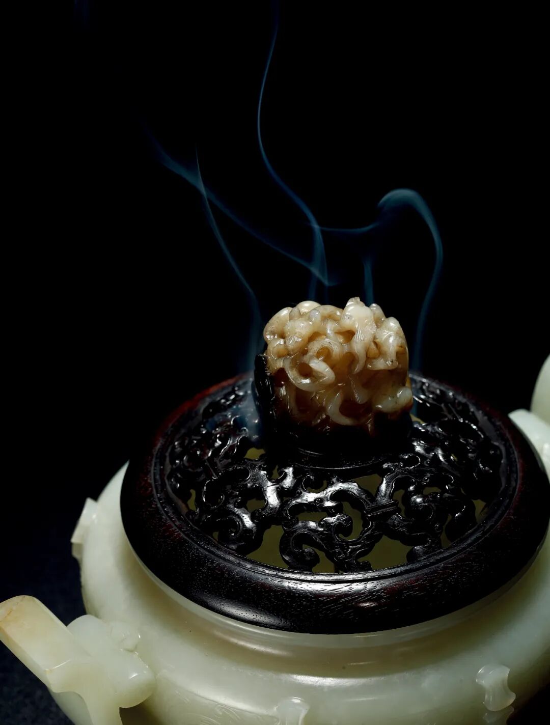 原配盖以紫檀为材,盖面镂雕灵芝纹,上置螭龙纹玉炉顶,炉顶布满水银沁,气韵古朴。只见两条螭龙盘旋于枝条之上,动态传神。香炉质地莹润,内壁打磨光洁,雕工精细大方,颇有商周鼎彜古朴稳重之感。盖炉为清代皇家及士大夫的书房常备之物。