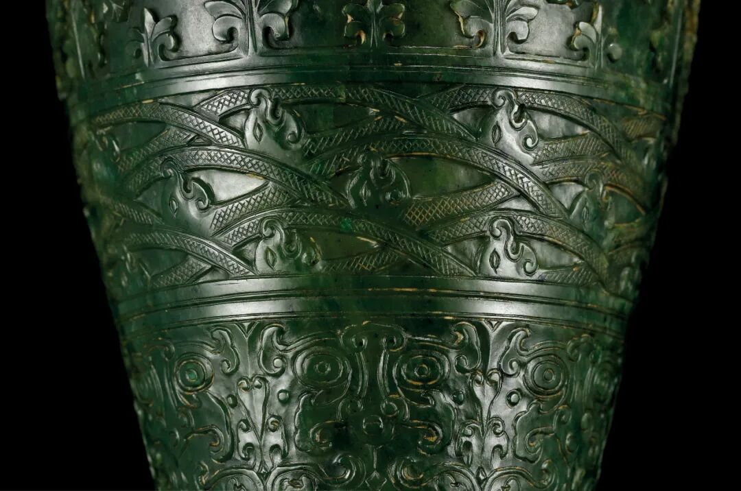 中段浮雕海水龙纹,水浪翻涌唯见神龙尾。下段纹饰兽面及蝉翼纹,整体装饰纹样丰富多变,雕琢工艺细腻,彰显出浓郁的宫廷风格。此件梅瓶,碧玉色泽沈稳,器型小巧玲珑,优雅隽永,纹饰浮雕,立体感强,采用西番莲装饰,等级甚高,是不可多得的精品。