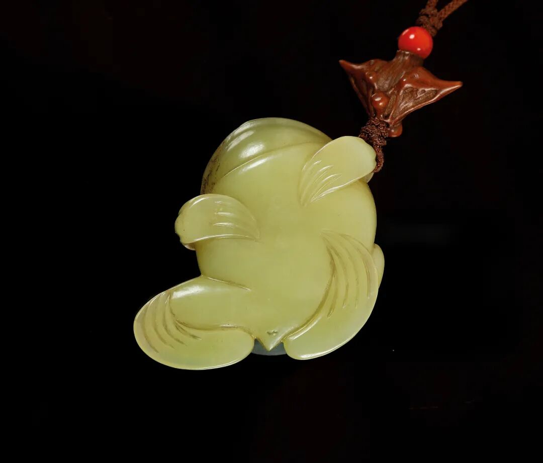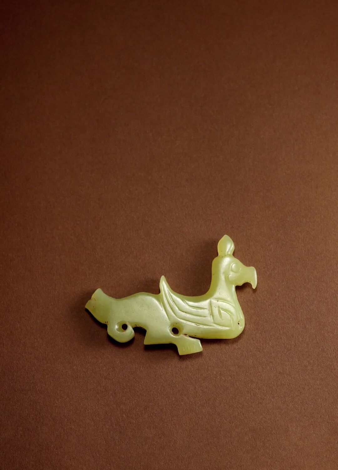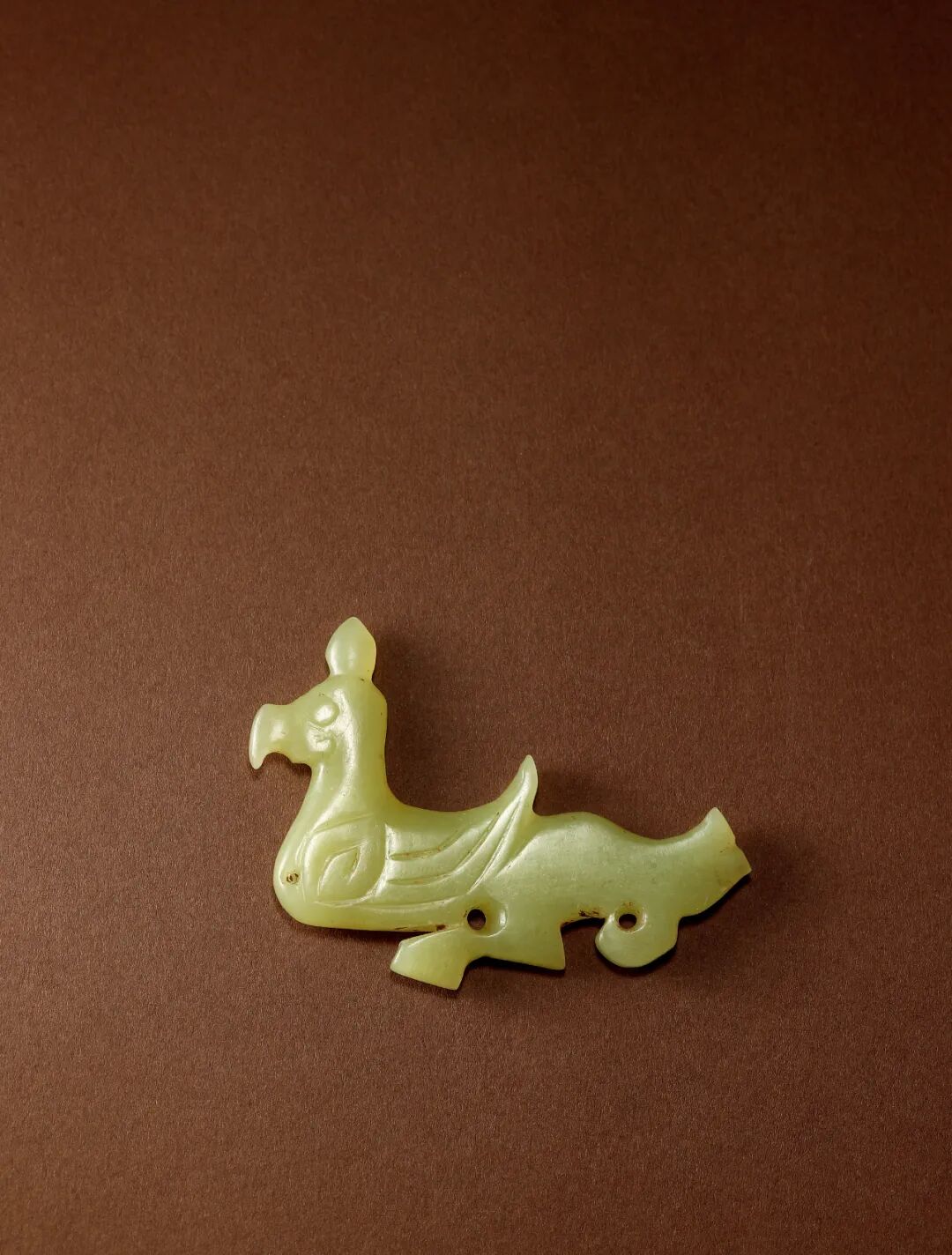 说明: 黄玉色郁质厚,温润有油脂感。佩作凤鸟形,呈横向伏卧状。尖喙细长内钩,圆眼凸出,羽冠高耸,翅羽后扬,以宽深阴线刻画羽翼,线条犀利传神。下有健壮的双腿和爪连接后方尾部,鸟胸部、翅尾三处皆有反复打磨过的孔洞,可穿绳挂佩。凤为鸟中之王,是尊贵、贤德的象征,含有美好而又不同凡俗之意。此玉鸟神态娇憨可爱,古朴稚拙,包浆自然温润,气韵高古,具有商代玉器特征。