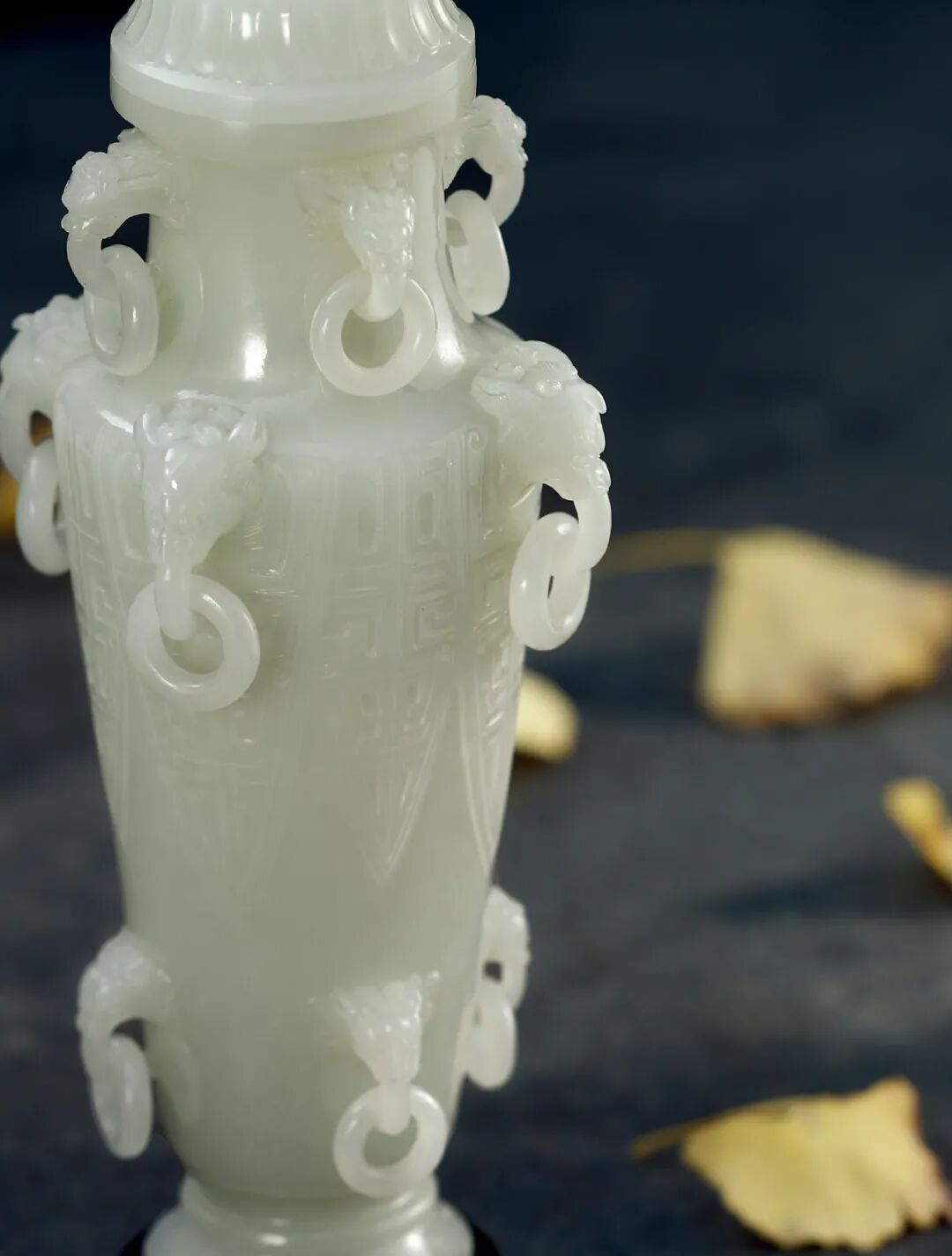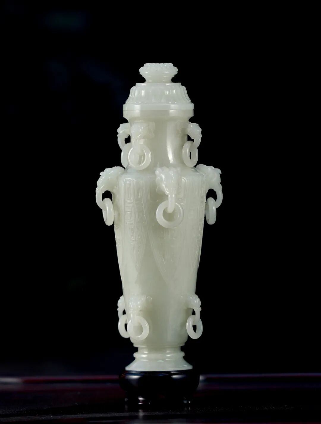 杨门旧藏·清乾隆·白玉仿古蕉叶纹兽衔十二活环耳尊