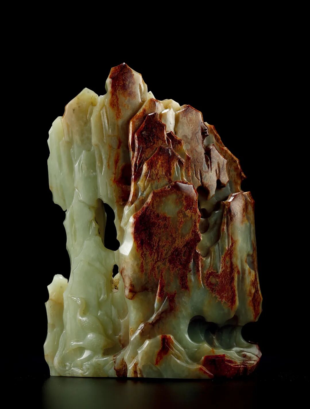 玉山子,是按玉料的形状、颜色、绺裂进行设计,去除瑕疵,掩其绺裂,顺其色泽, 使料质、颜色、造型浑然一体。玉山子在设计中随料“出意”,可粗工、可细工、可浮雕、可深雕、可山水、可人物、可亭台楼阁、草屋石洞,还可牛马动物、翎毛花卉,可远近景布局,散点透视,尽心安排,以取得材料、立意、工艺三方面的统一效果。本品玉料珍贵、立意高远,雕工精湛,层次丰富,立体感极强,展现出山水与禅的意境,确是大家妙笔。