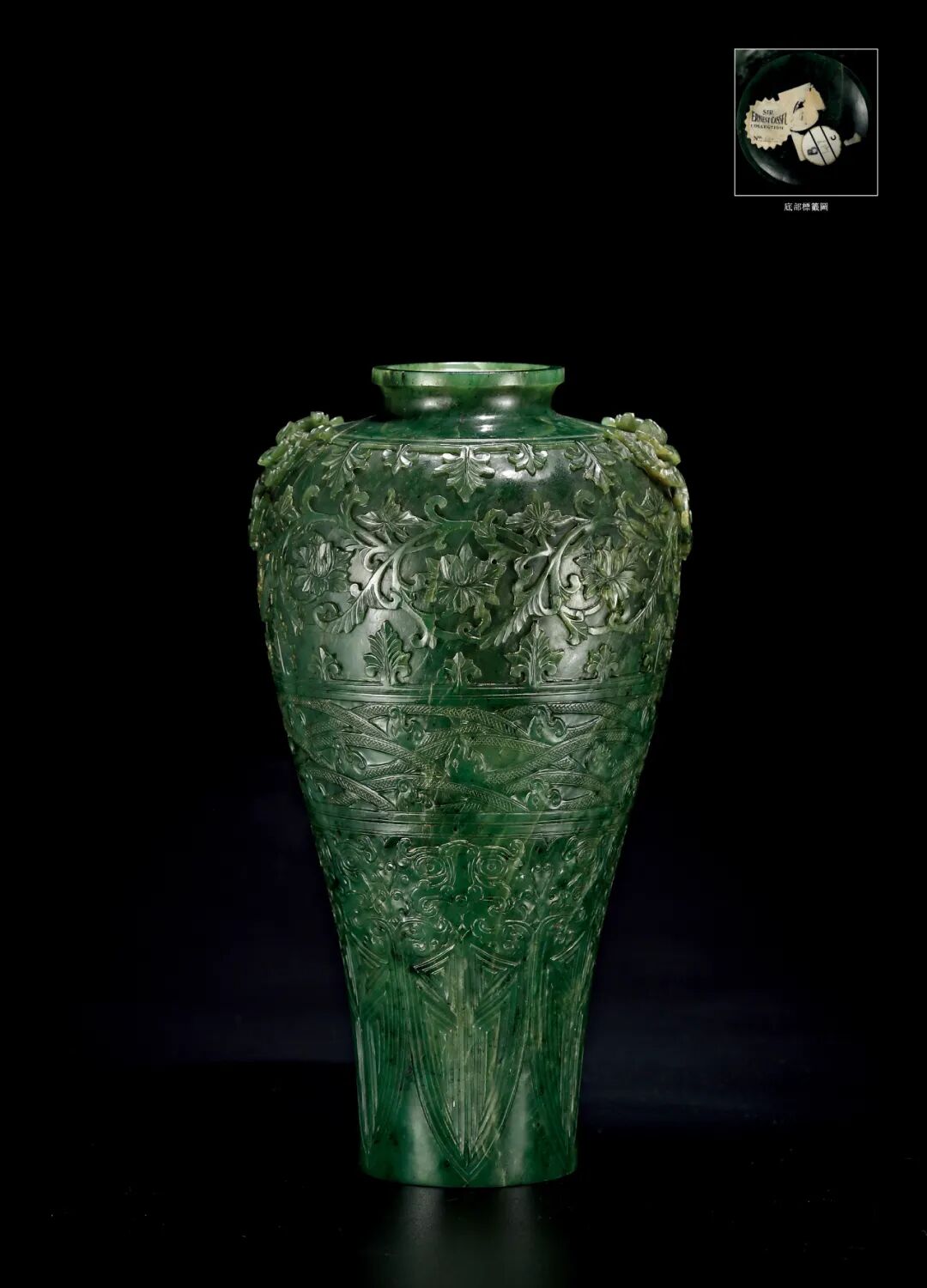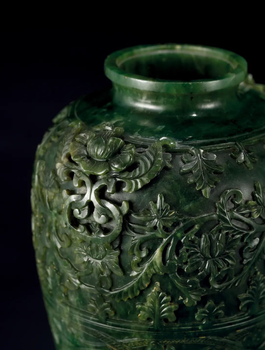 碧玉雕梅瓶,梅瓶的形制特殊,其瓶口小,不易掏膛,故而清代宫中作陈设用的大型玉件器物中,梅瓶非常稀见。此器小口圆唇,束颈,丰肩,腹部斜收,浅足略内凹。瓶外壁以环带区隔,上段腹部压地阳起,以剔地浮雕法呈现缠枝番莲纹,瓶肩两边镂雕盛放的莲花衔环耳,展现极佳的三维效果。