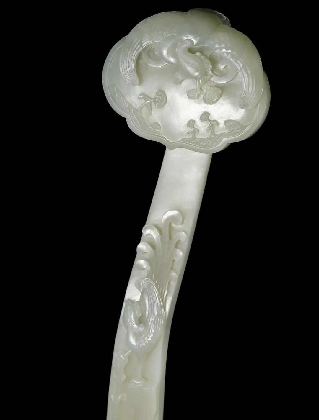 清·白玉高浮雕凤衔牡丹纹如意摆件