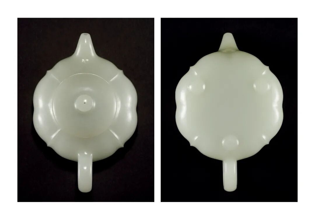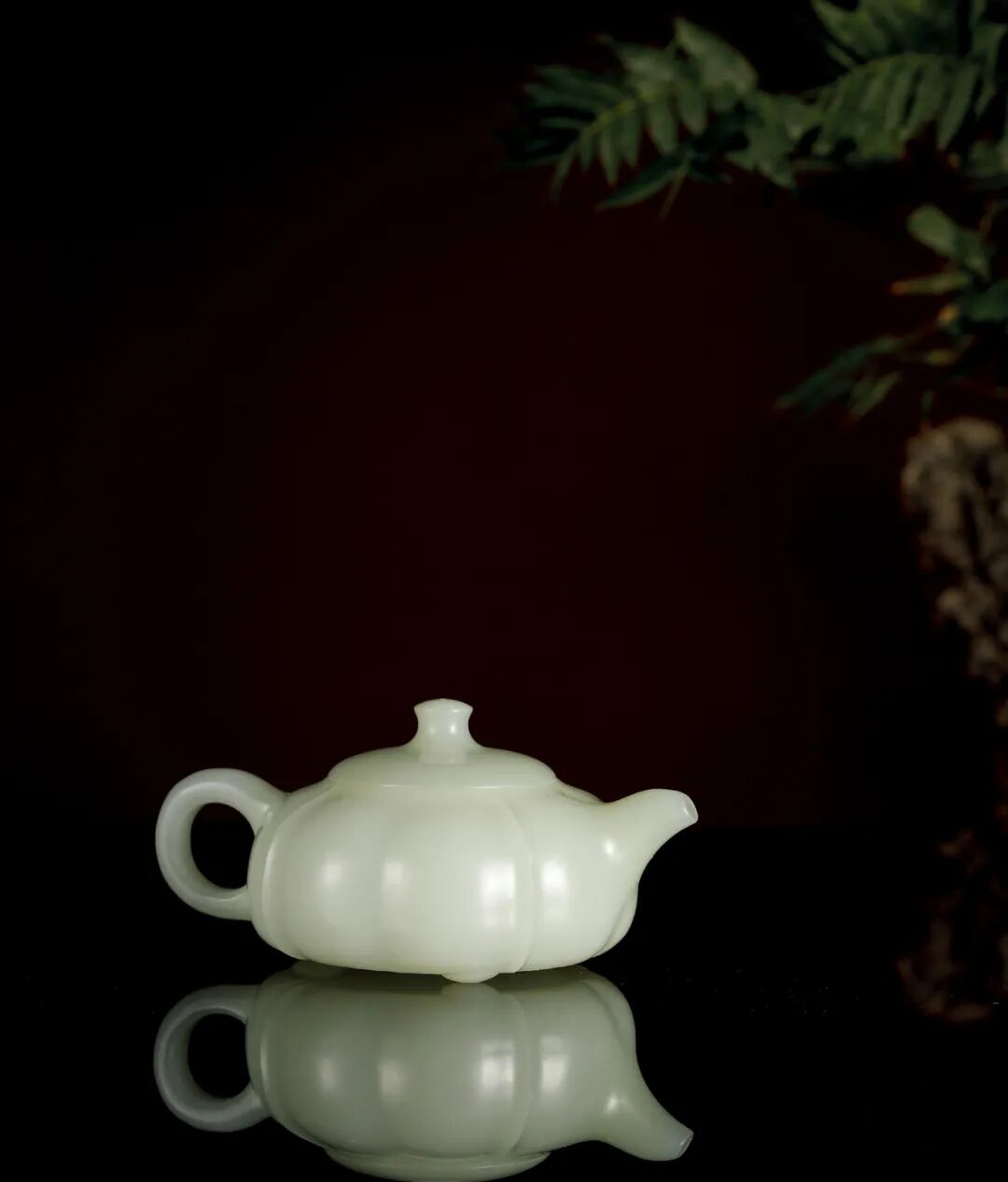 说明:白玉质,几无杂质的纯净外表如凝脂般莹洁通透,泛著美玉特有的柔润光泽。壶盖与壶身结合紧密,壶身呈四瓣瓜棱形,壶嘴短而流美,壶把圆润,下承三乳足,形制饱满,美观典雅。此件玉壶器型端庄,打磨精良,赏玩与实用性兼具,且颇具清中期玉器制作风格。
