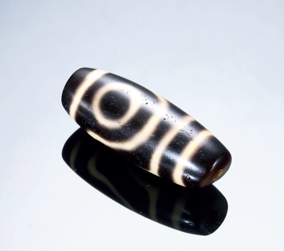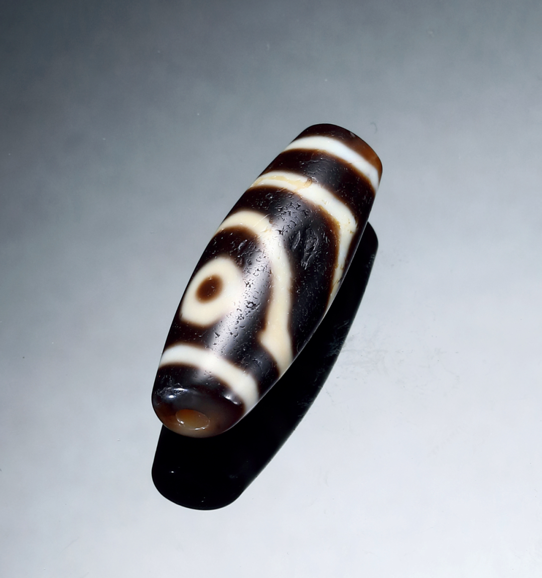 天珠对孔长约32.2mm,珠体最大直径约11.7mm,孔口直径分别为2.1mm和2.3mm,重6克。
