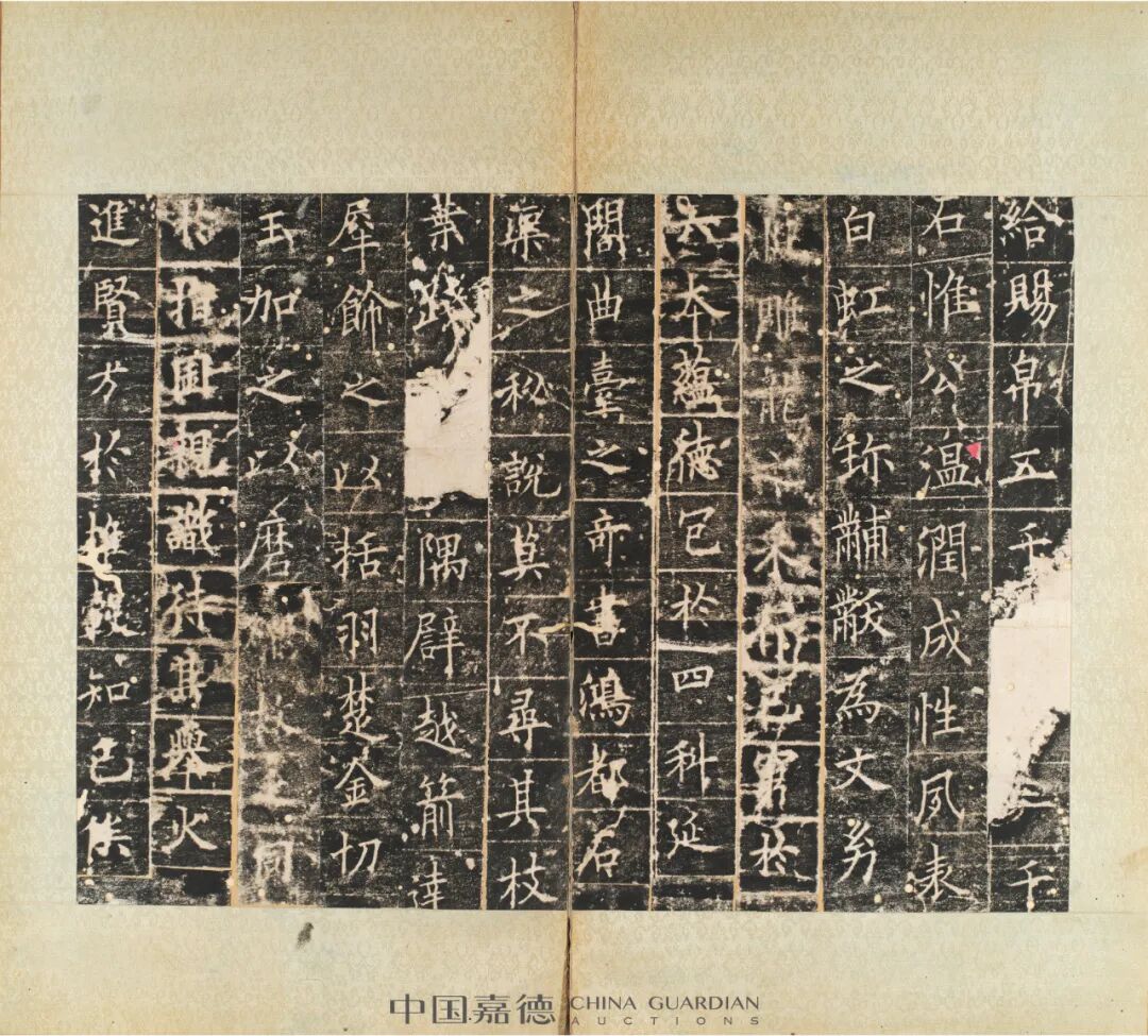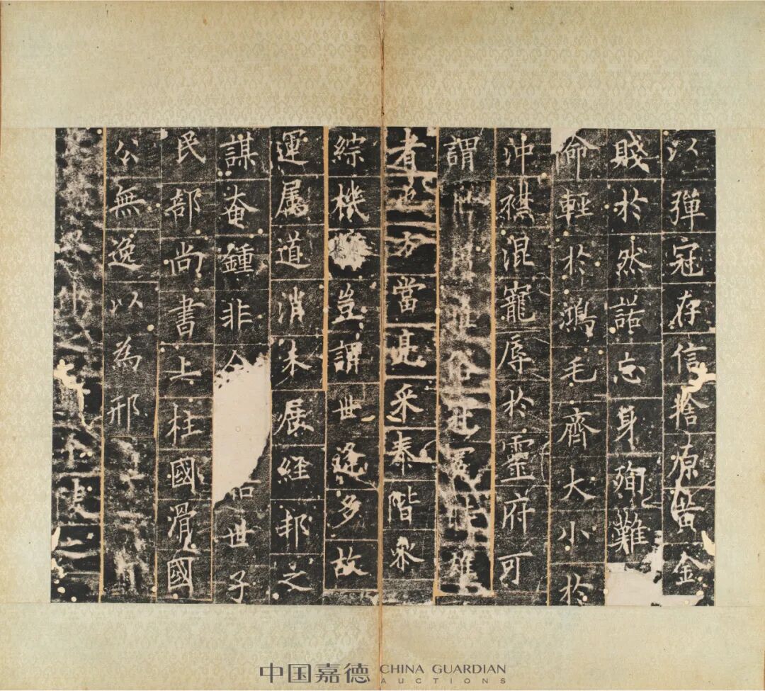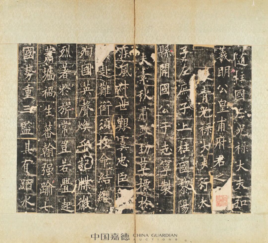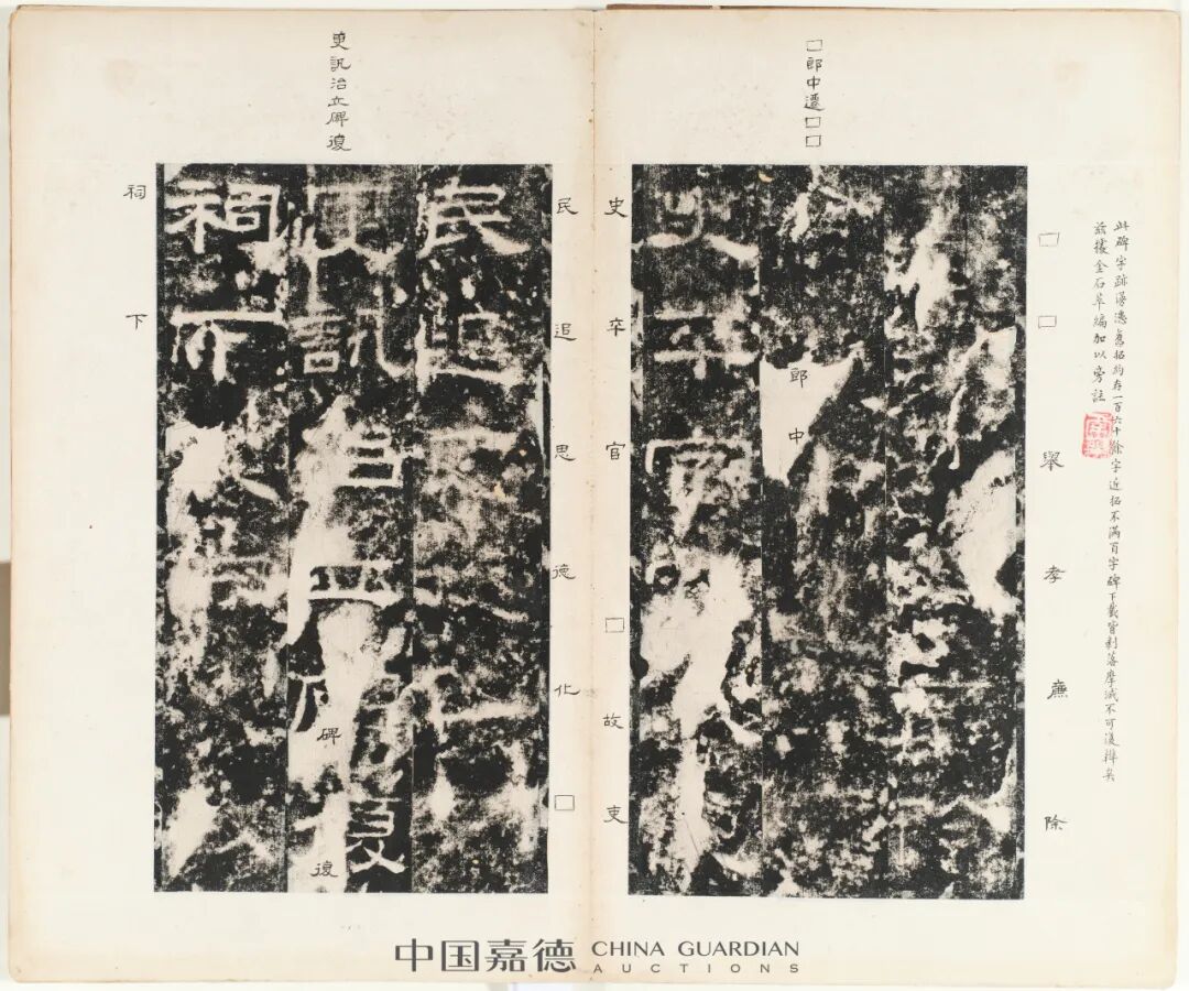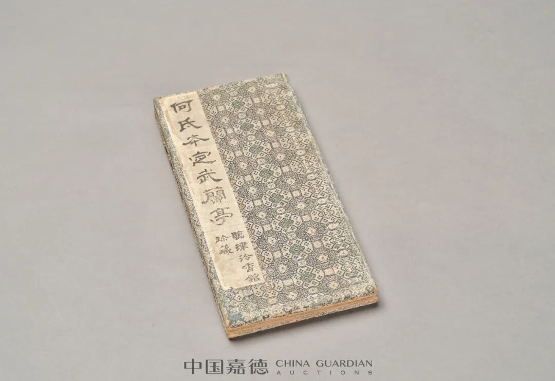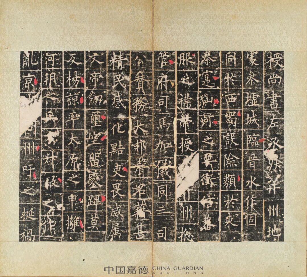 是拓前后织锦封面,绫面裱边,开本宽大。刘喜海、王戟门旧藏。刘喜海(1793-1852),字燕庭。山东诸城人。嘉庆二十一年(1816)举,官至浙江布政使。藏书楼名嘉荫簃、味经书屋、清爱堂等。善鉴赏金石。著有《海东金石苑补遗》、《长安获古编》等。王戟门(1832-?),名锡棨,以字行。山东诸城人。官至刑部广西司郎中。博学好古,笃好篆刻。作为"商盉堂"第二任主人,继承父业,搜藏泉币、汉魏碑帖、书画甚多。著有《泉货汇考》、《金石家题跋存录》、《邃古客藏古刻录》等。是碑唐贞观十七年(643)立,于志宁撰文,欧阳询正书,碑额篆书"隋柱国弘义明公皇甫府君碑"。明代移至西安碑林,现在陕西。“金石碑帖”专场Lot 13359 – Lot 13368为杨士英旧藏。杨士英,字季华,民国间南京著名学者、碑帖收藏家,中国近代著名建筑学家杨廷宝先生长女。此次所集以汉碑及北魏墓志为主。