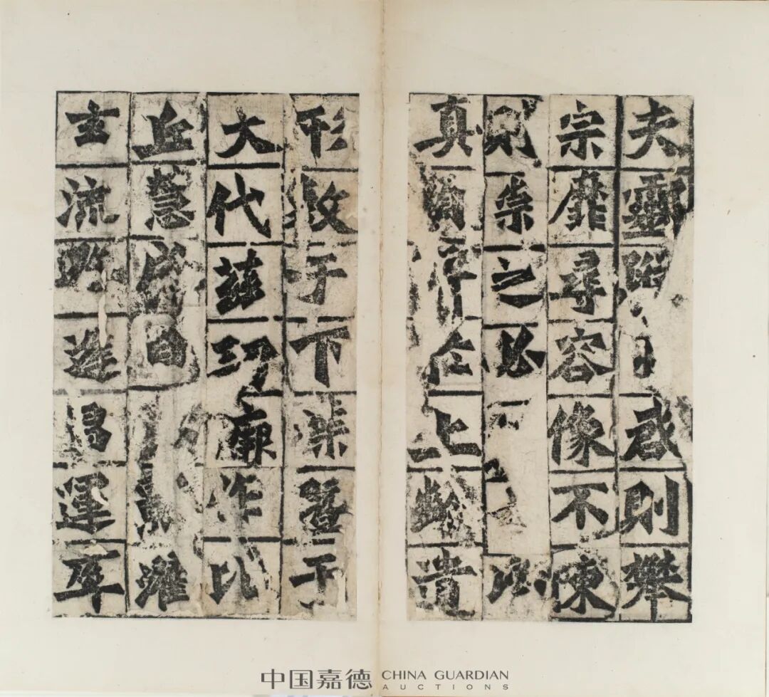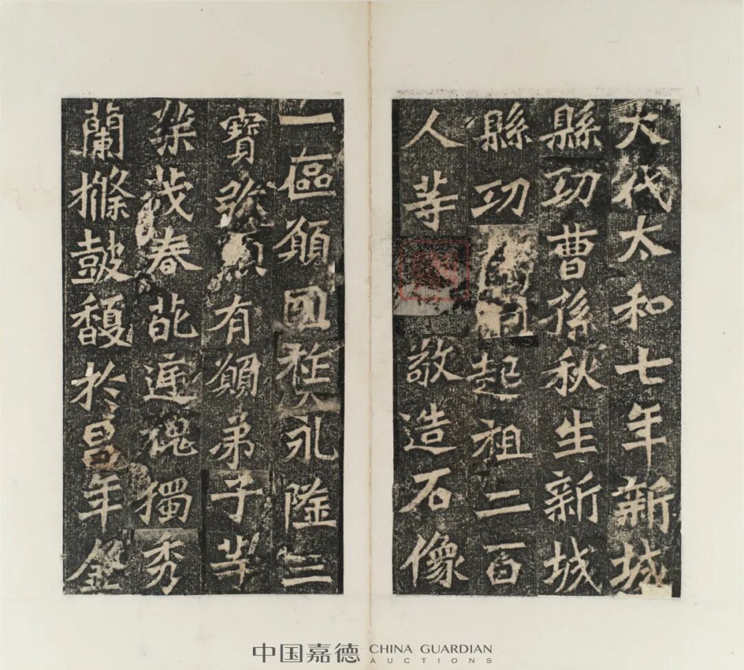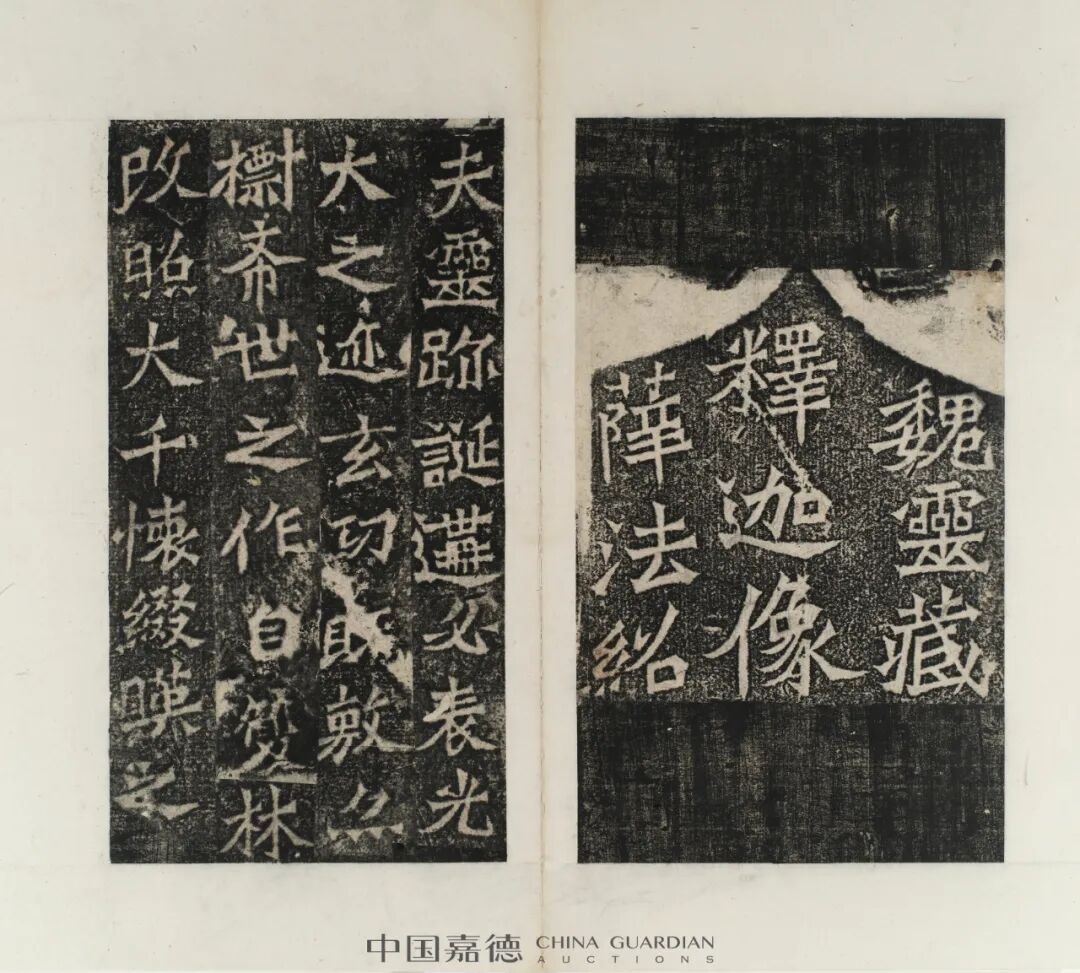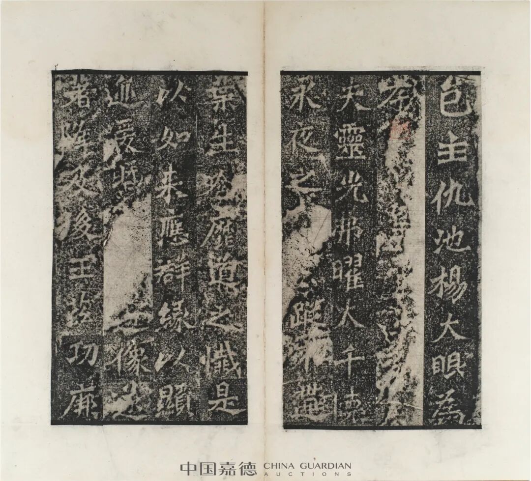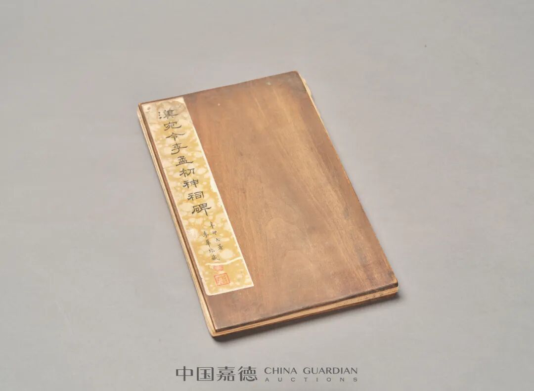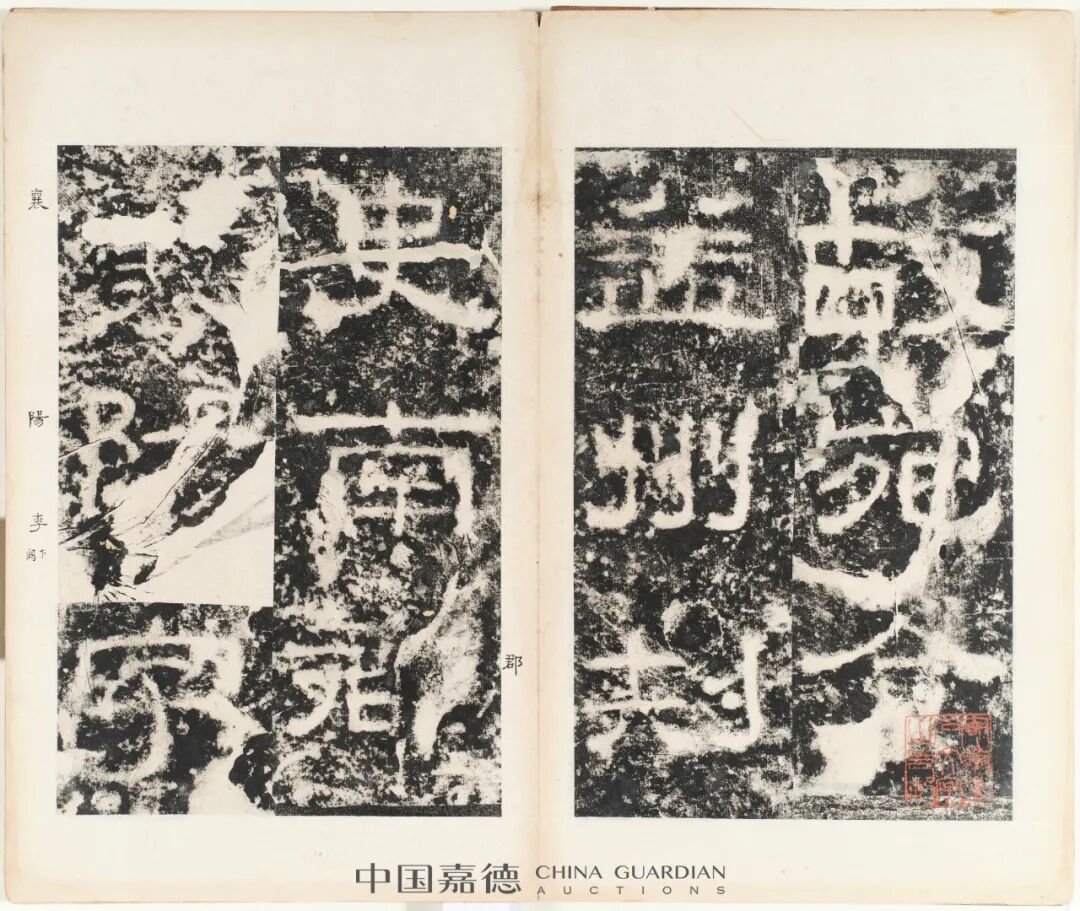 是拓前后织锦封面,绫面裱边,开本宽大。刘喜海、王戟门旧藏。刘喜海(1793-1852),字燕庭。山东诸城人。嘉庆二十一年(1816)举,官至浙江布政使。藏书楼名嘉荫簃、味经书屋、清爱堂等。善鉴赏金石。著有《海东金石苑补遗》、《长安获古编》等。王戟门(1832-?),名锡棨,以字行。山东诸城人。官至刑部广西司郎中。博学好古,笃好篆刻。作为"商盉堂"第二任主人,继承父业,搜藏泉币、汉魏碑帖、书画甚多。著有《泉货汇考》、《金石家题跋存录》、《邃古客藏古刻录》等。是碑唐贞观十七年(643)立,于志宁撰文,欧阳询正书,碑额篆书"隋柱国弘义明公皇甫府君碑"。明代移至西安碑林,现在陕西。“金石碑帖”专场Lot 13359 – Lot 13368为杨士英旧藏。杨士英,字季华,民国间南京著名学者、碑帖收藏家,中国近代著名建筑学家杨廷宝先生长女。此次所集以汉碑及北魏墓志为主。